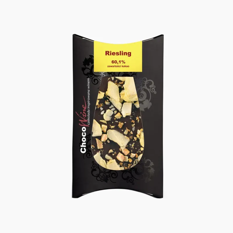 Odnoszącą coraz większe sukcesy odmiana kojarząca się z białymi winami ze środkowo-zachodniej Europy. Odrzucona w drugiej połowie XX wieku przeżywa teraz swój renesans. Kiedy jest młode ukazuje najczęściej aromaty białych i cytrusowych owoców z nutami kwiatów polnych, czasem miodu. I taki jest właśnie nasz Riesling. W czekoladę wtopiony jest miód kwiatowy, a na tabliczce znajdziemy jabłka i jaśmin w cukrze. Wszystkie te zapachy i smaki przełamane są limonkami.