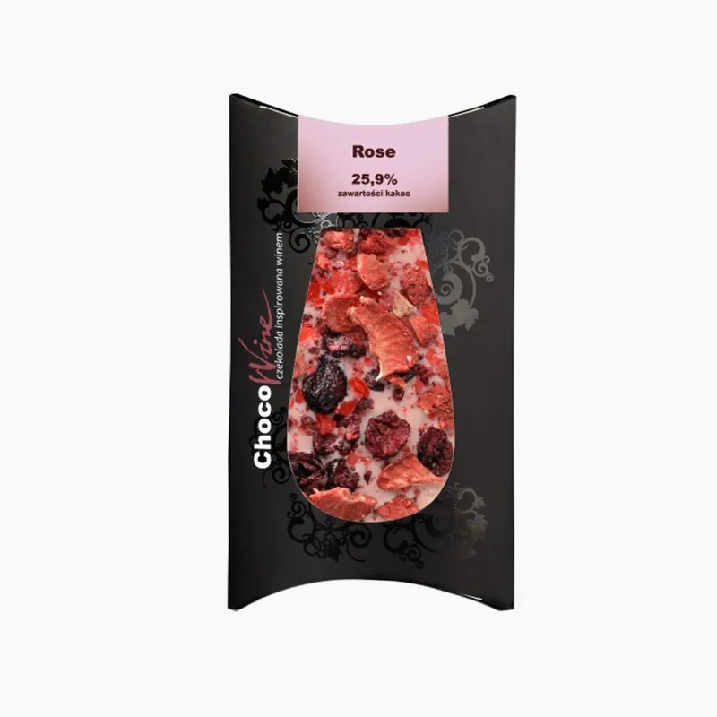 Różowe wina potrafią być cieliste, łososiowe, bladoróżowe, żywe i wyraźne czy wręcz krwiste. Mimo, iż są robione z różnych odmian, są macerowane w różnym czasie i w różnych temperaturach łączy je jedno: bukiet złożony z tak przyjemnych aromatów jak landrynka, czereśnia, wiśnia, poziomka, truskawka czy czerwona porzeczka. Nasza czekolada swoim kolorem i kruszoną landrynką zachwyca oczy niczym różowe wino. Głębi barwie dodają czerwone owoce truskawki i wiśni, które w smaku równoważą słodycz czekolady swoją kwasowością.