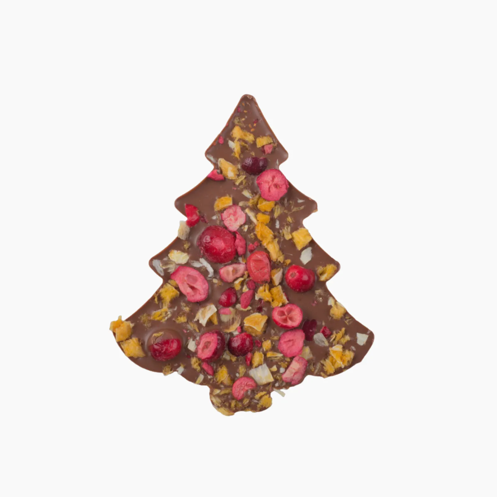 Choinka z wyśmienitej mlecznej czekolady z pyszną żurawiną i aromatyczną pomarańczą.