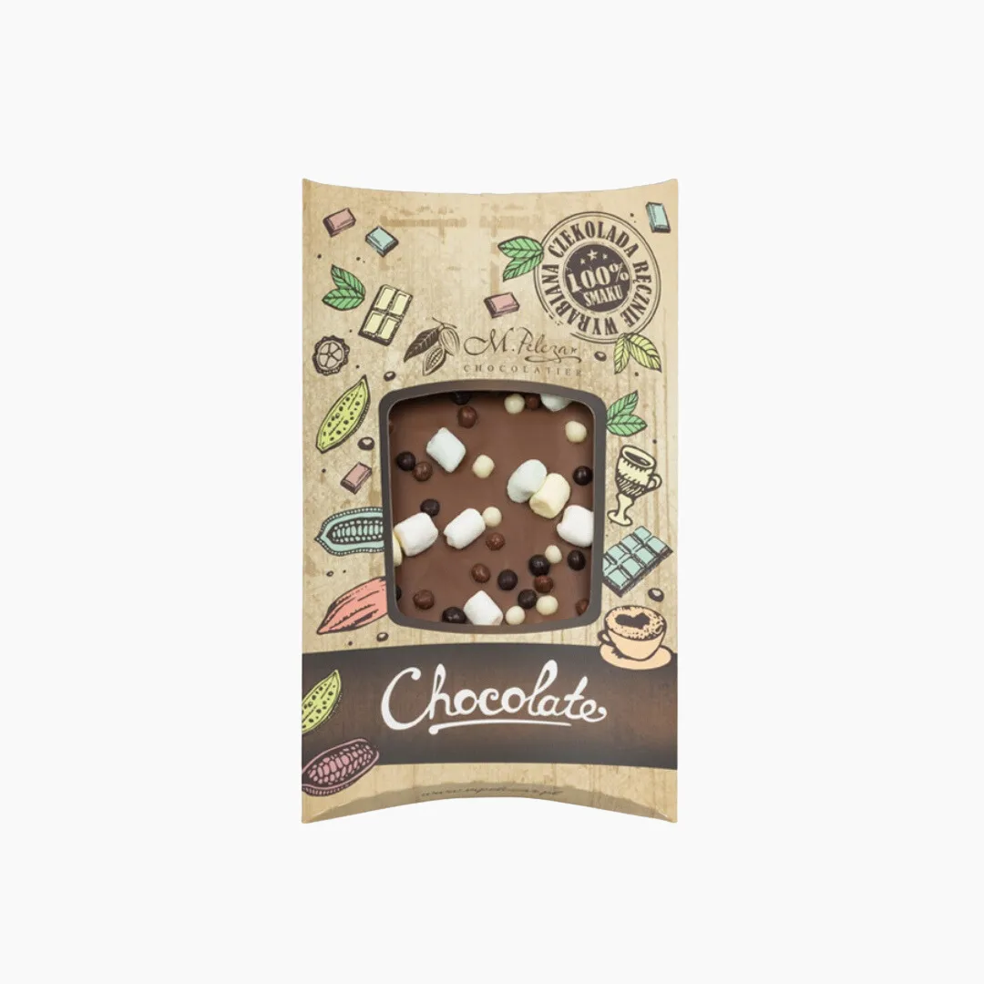 Czekolada dedykowana dzieciom – posiada wspaniały smak i aromat oraz słodkie dodatek – pianki Marshmallows oraz chrupiące kulki czekoladowe, które uwielbiają dzieci.
