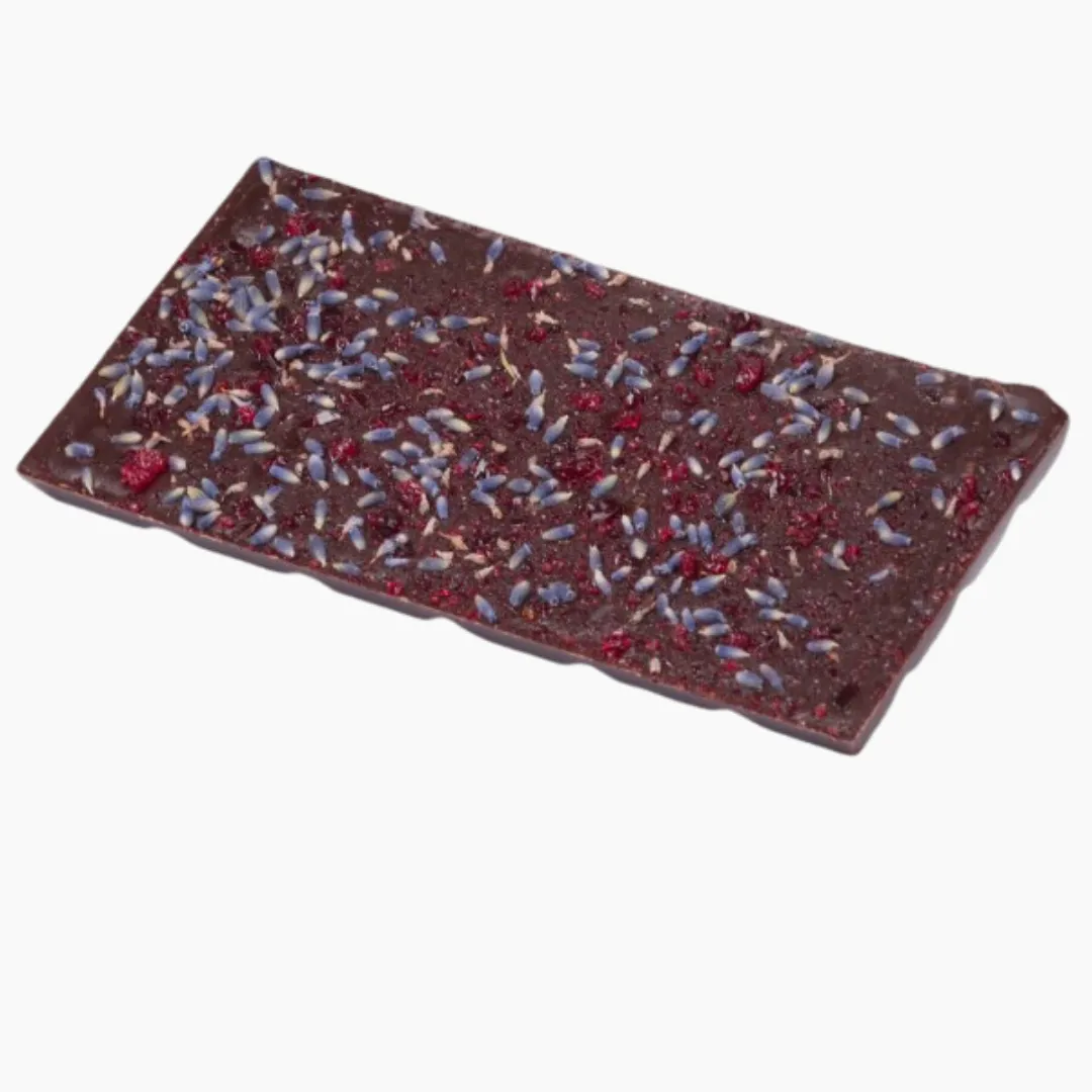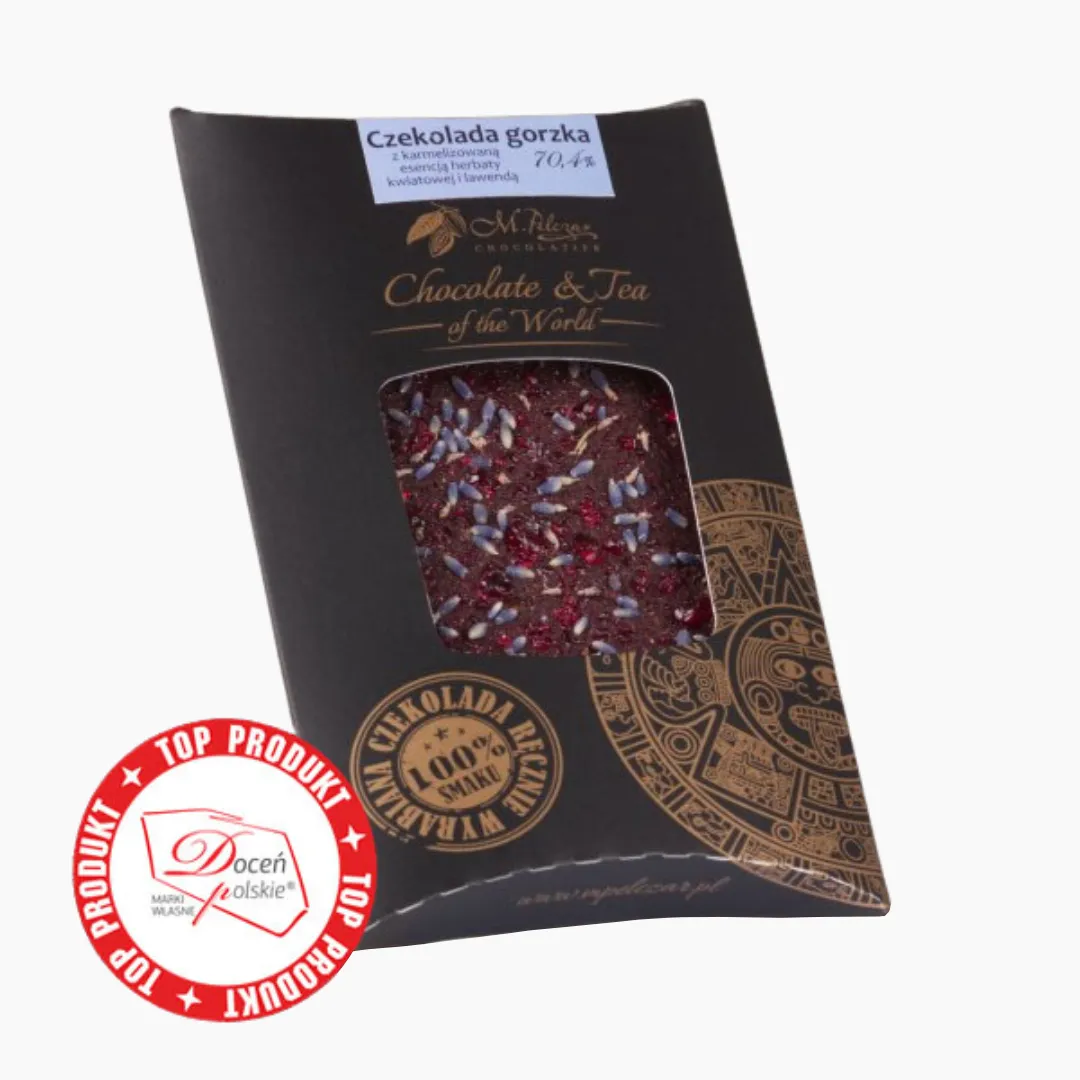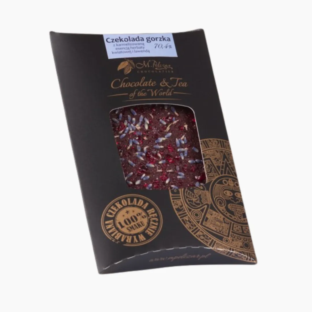 Czekolada gorzka 70,4% z karmelizowaną esencją herbaty kwiatowej i lawendą