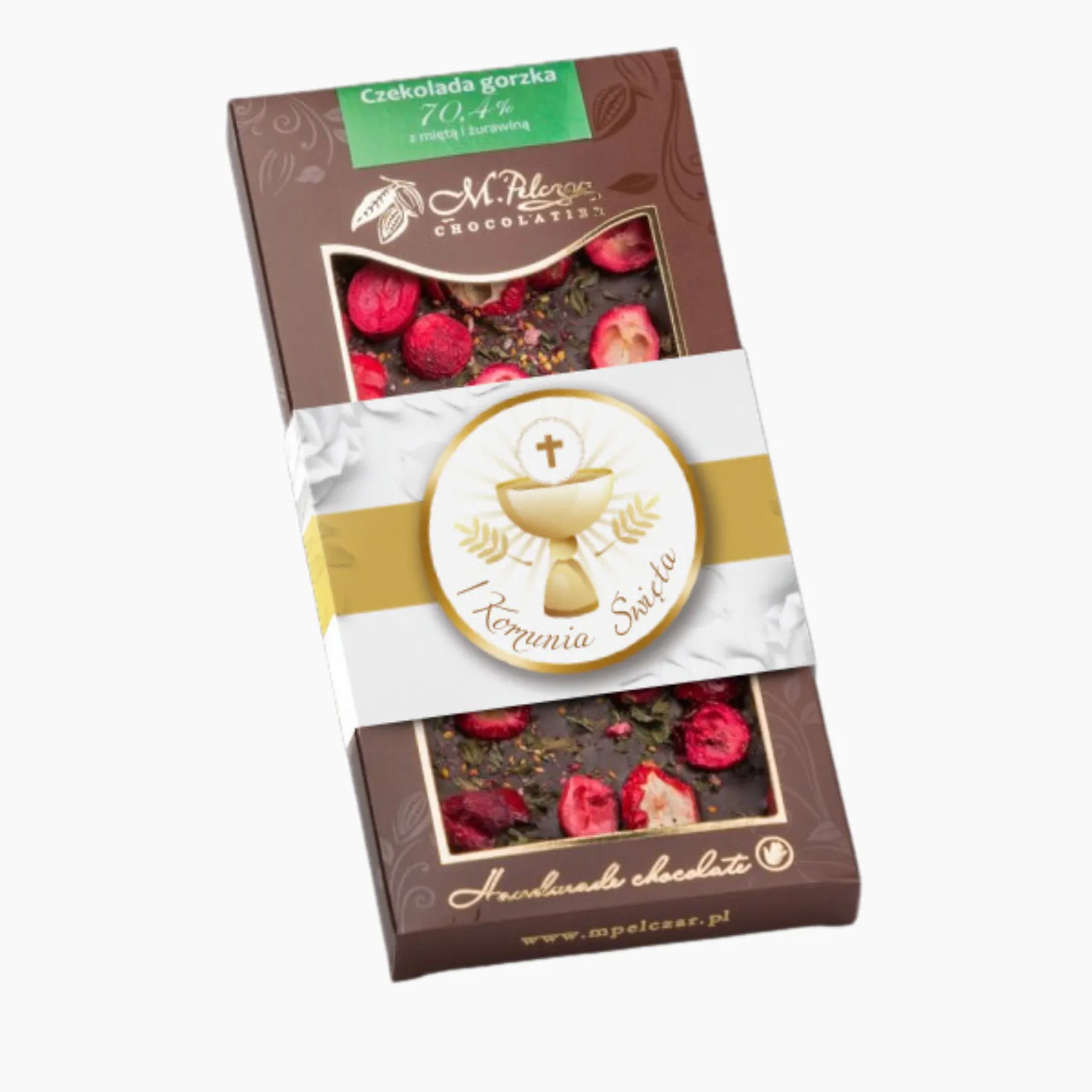 Jest bardzo ciemna i gorzka, posiada wspaniały smak i aromat oraz delikatną nutę kwiatów, wyprodukowana z ziarna kakaowego pochodzącego z Afryki Zachodniej, wzbogacona naszą Polską aromatyczną miętą i żurawiną tworzy idealny duet.