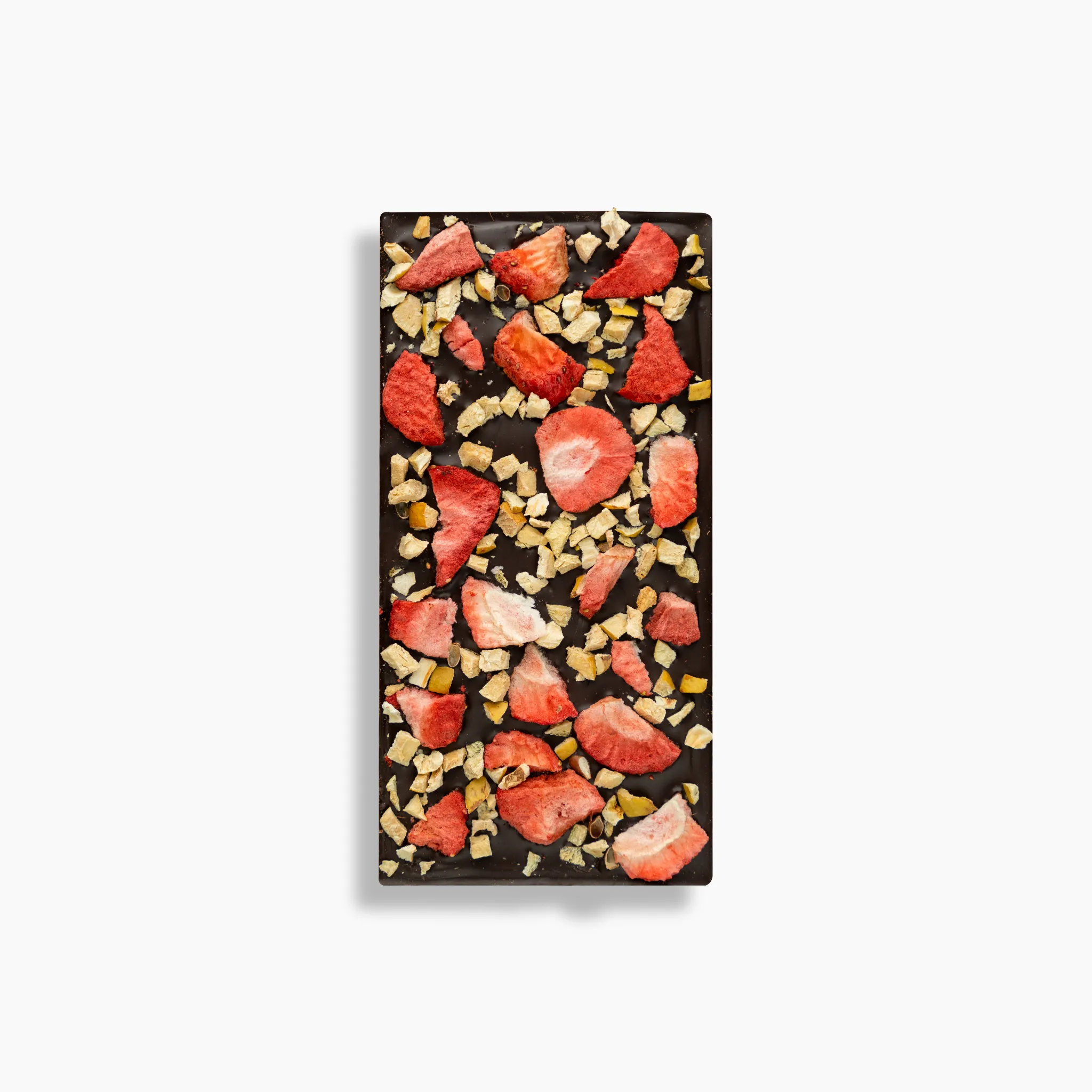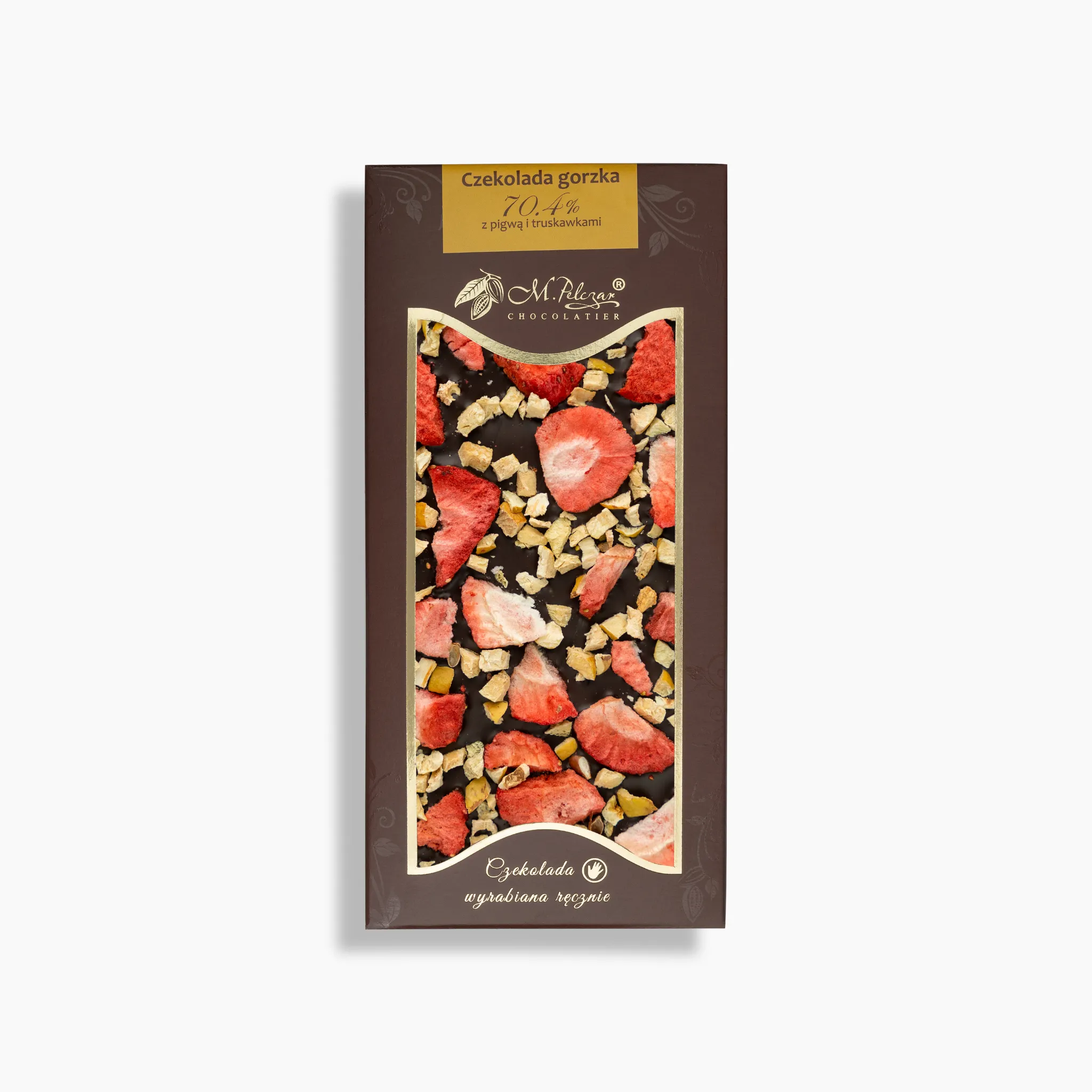 Składniki: czekolada gorzka (miazga kakaowa, cukier, proszek kakaowy o obniżonej zawartości tłuszczu, emulgator: lecytyna sojowa, naturalny aromat waniliowy), truskawki liofilizowane 2,5%, pigwa liofilizowana 2,5%. Masa kakaowa minimum 70,4 %.