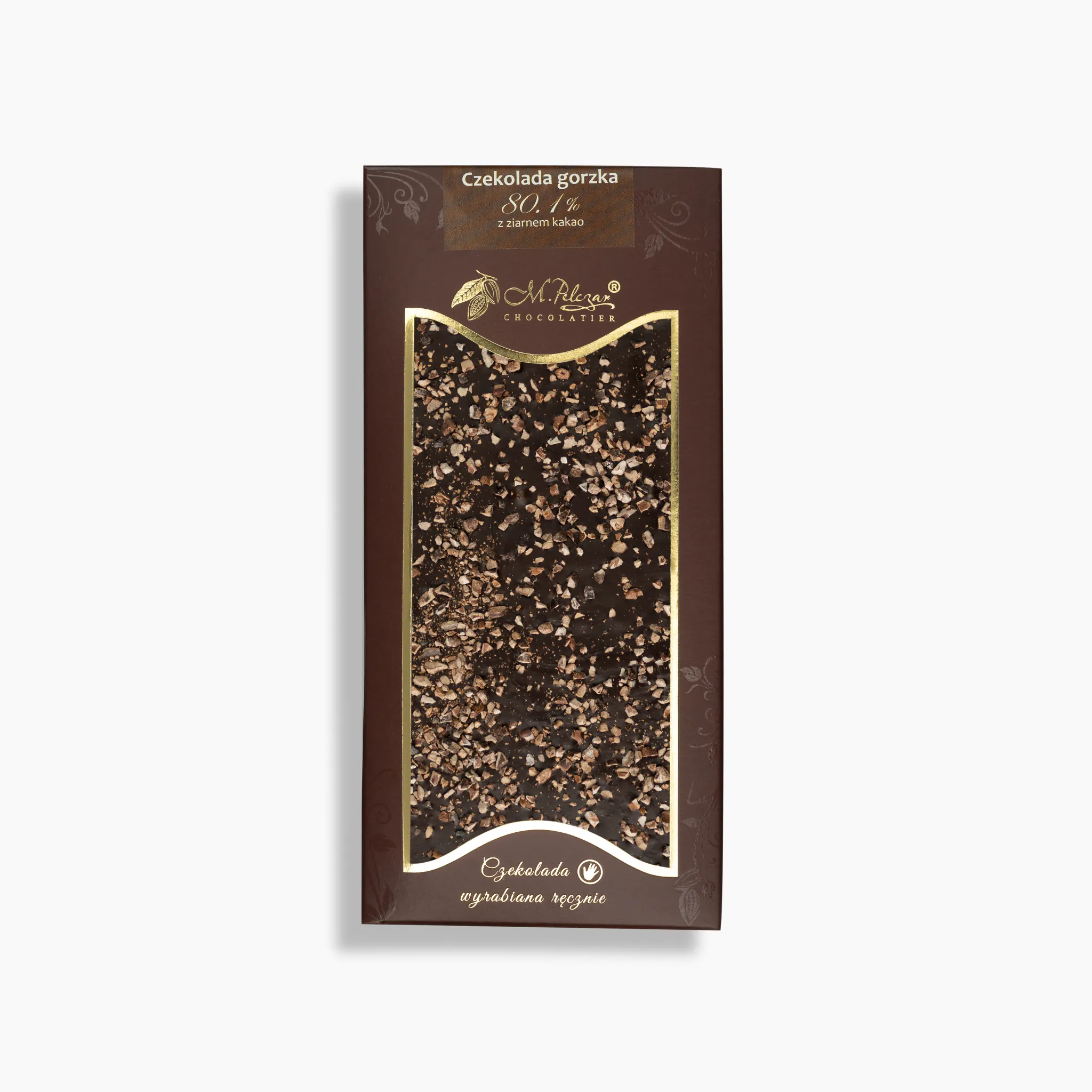 Składniki: czekolada gorzka (miazga kakaowa, cukier, proszek kakaowy o obniżonej zawartości tłuszczu, emulgator: lecytyna sojowa, naturalny aromat waniliowy), prażone ziarno kakao 3,5%. Masa kakaowa minimum 80,1 %.