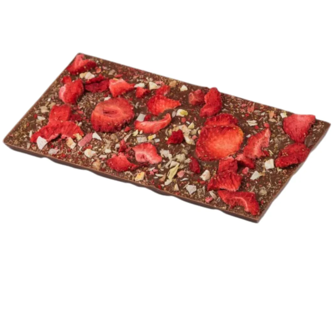 Składniki: czekolada mleczna (cukier, tłuszcz kakaowy, mleko pełne w proszku, miazga kakaowa, emulgator: lecytyna sojowa, wanilia Bourbon), truskawki liofilizowane 2,35%, cytryny liofilizowane 1,17% imbir mielony 0,23%. Masa kakaowa minimum 33,4.%.