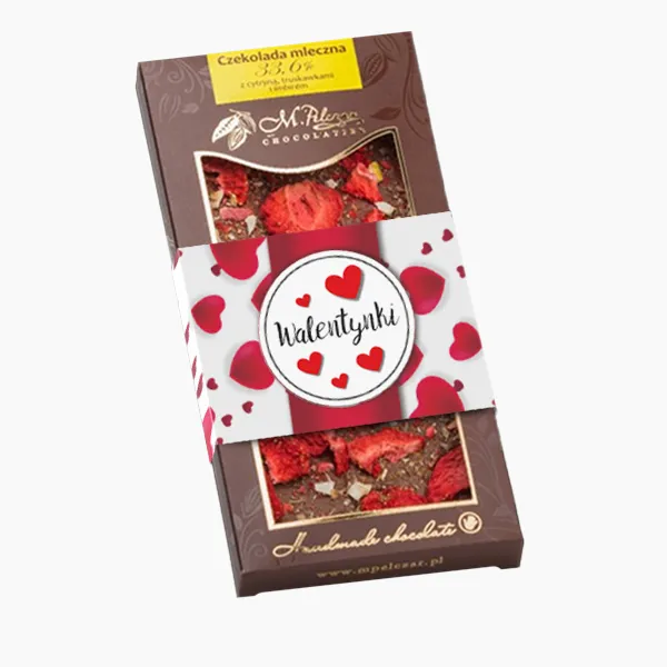 Orzeźwiająca cytryna, słodycz polskich truskawek i delikatna nuta imbiru, zadziwia wspaniałym smakiem i idealną harmonią, to wszystko zatopione w wyjątkowo delikatnej mlecznej czekoladzie, która charakteryzuje się ciepłym kolorem i zrównoważonym smakiem ziarna kakaowego, mleka i karmelu.
