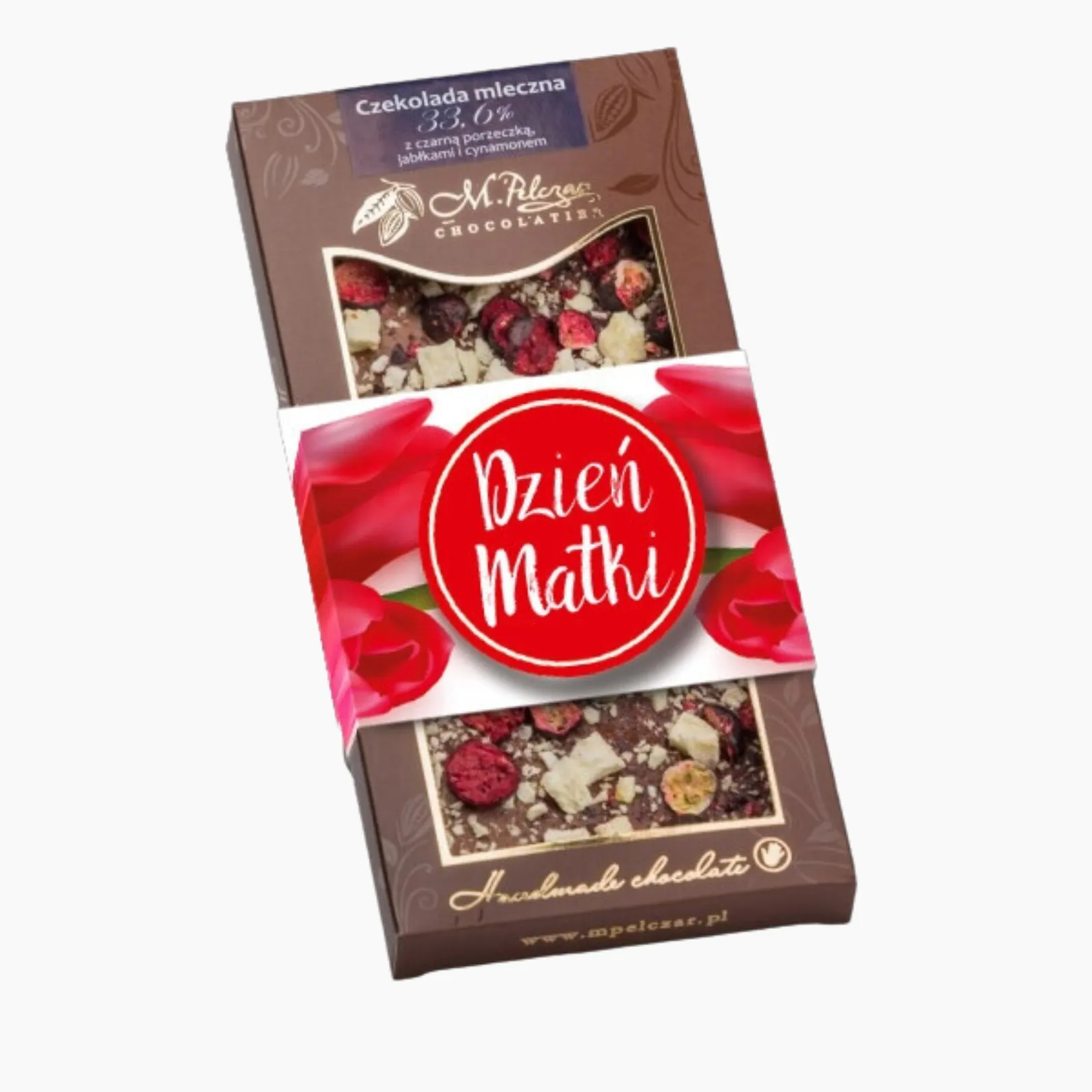 Składniki: czekolada mleczna (cukier, tłuszcz kakaowy, mleko pełne w proszku, miazga kakaowa, emulgator: lecytyna sojowa, wanilia Bourbon), czarna porzeczka liofilizowana 2,94%, jabłka liofilizowane 2,94%, cynamon mielony 0,23%. Masa kakaowa minimum 33,4.%.