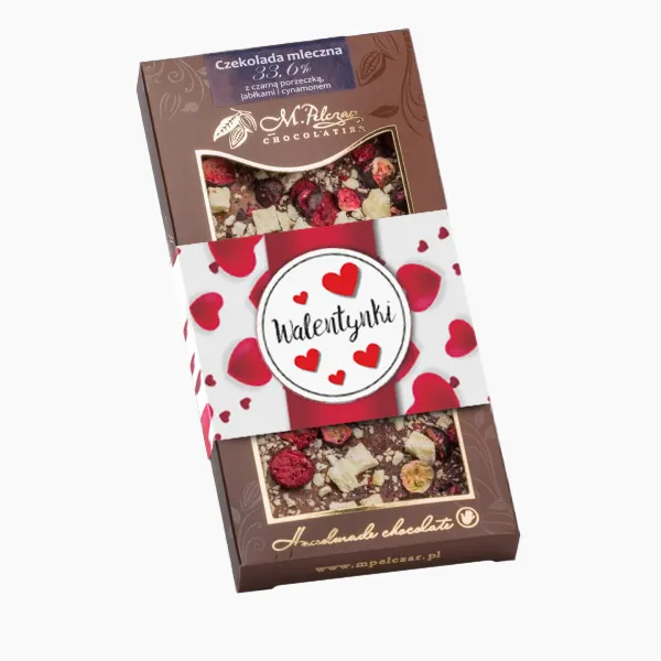 Składniki: czekolada mleczna (cukier, tłuszcz kakaowy, mleko pełne w proszku, miazga kakaowa, emulgator: lecytyna sojowa, wanilia Bourbon), czarna porzeczka liofilizowana 2,94%, jabłka liofilizowane 2,94%, cynamon mielony 0,23%. Masa kakaowa minimum 33,4.%.