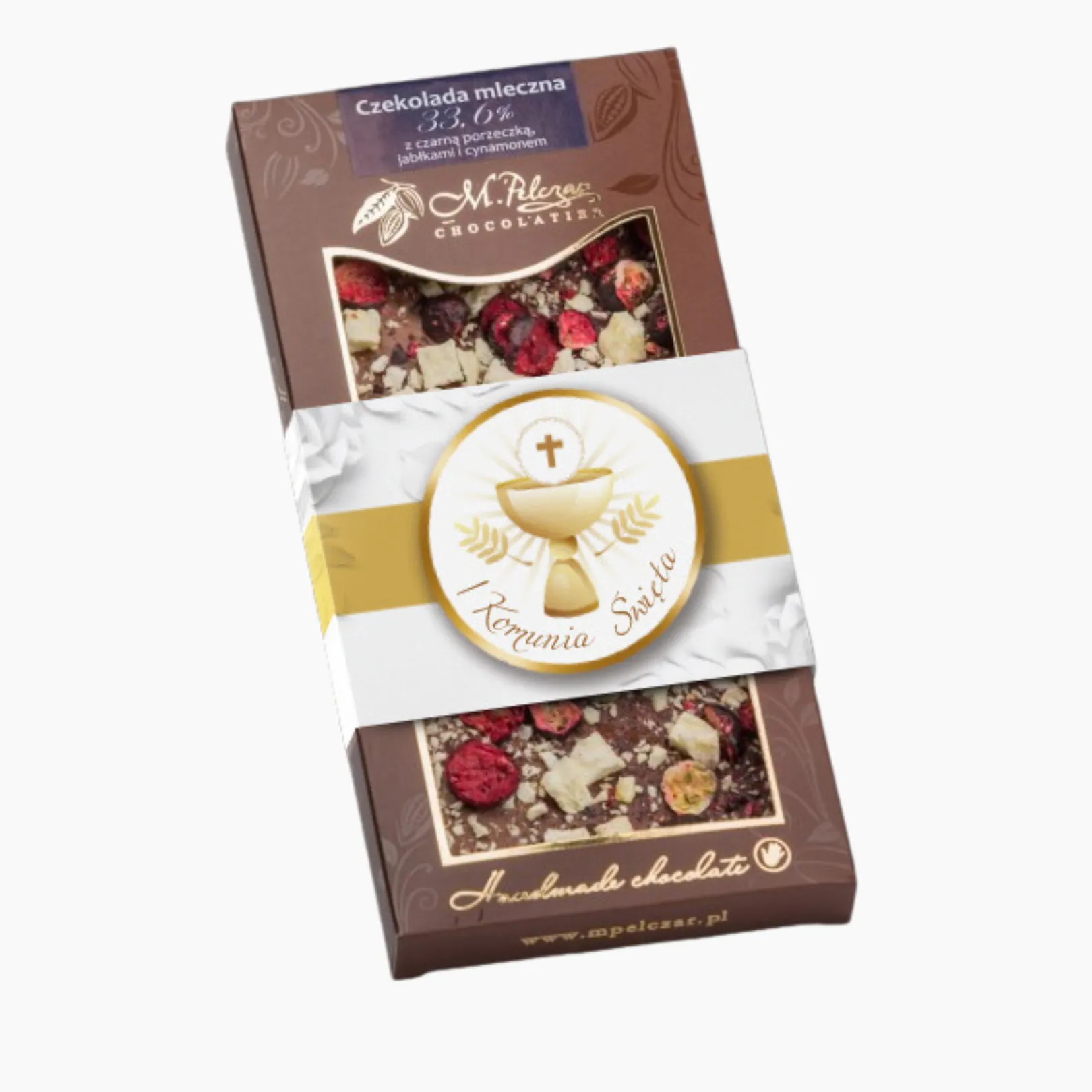 Składniki: czekolada mleczna (cukier, tłuszcz kakaowy, mleko pełne w proszku, miazga kakaowa, emulgator: lecytyna sojowa, naturalny aromat waniliowy), czarna porzeczka liofilizowana 2,94%, jabłka liofilizowane 2,94%, cynamon mielony 0,23%. Masa kakaowa minimum 33,4.%.