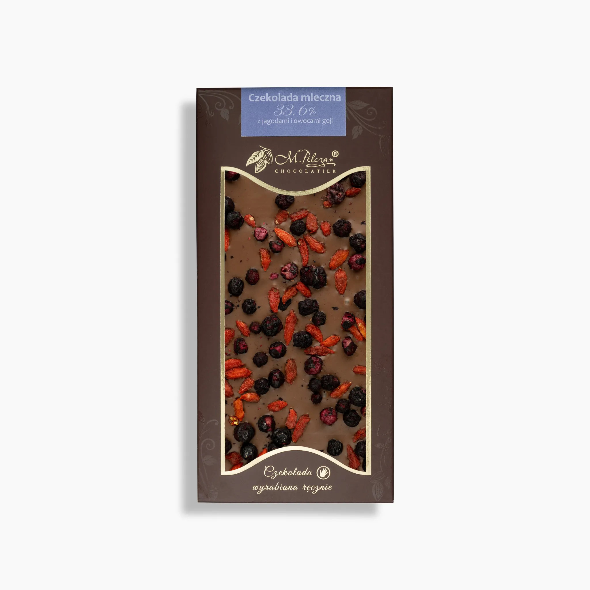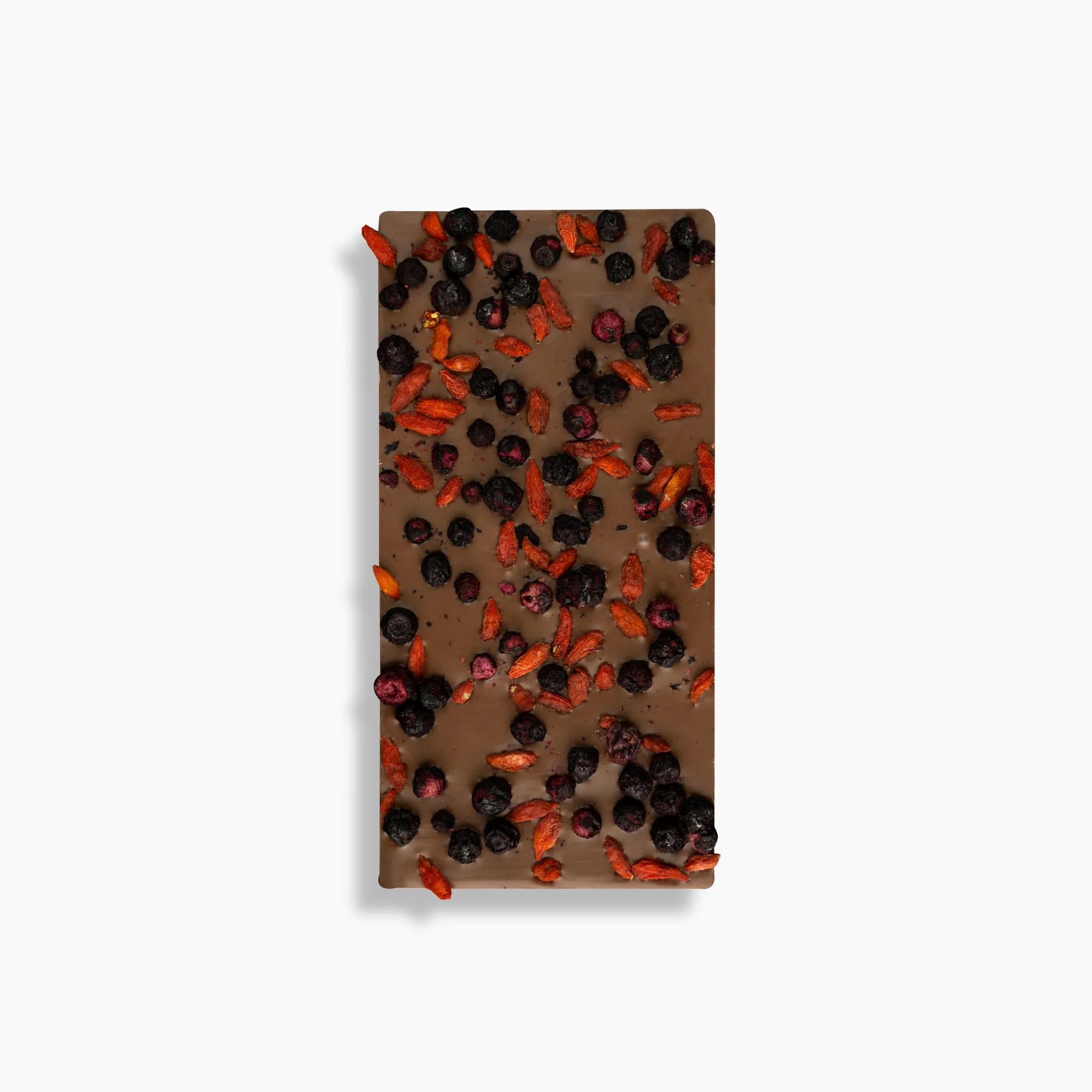 Składniki: czekolada mleczna ( (cukier, tłuszcz kakaowy , mleko pełne w proszku, miazga kakaowa, emulgator: lecytyna sojowa, wanilia Bourbon), suszone owoce goji 5,88%, jagody liofilizowane 3,52&. Masa kakaowa minimum 33,6%.