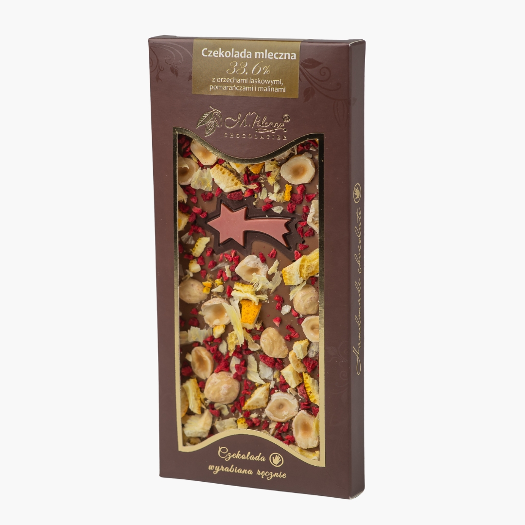 Magia Świąt w mlecznej czekoladzie, soczyste pomarańcze, świeże orzechy laskowe i orzeźwiające maliny.
