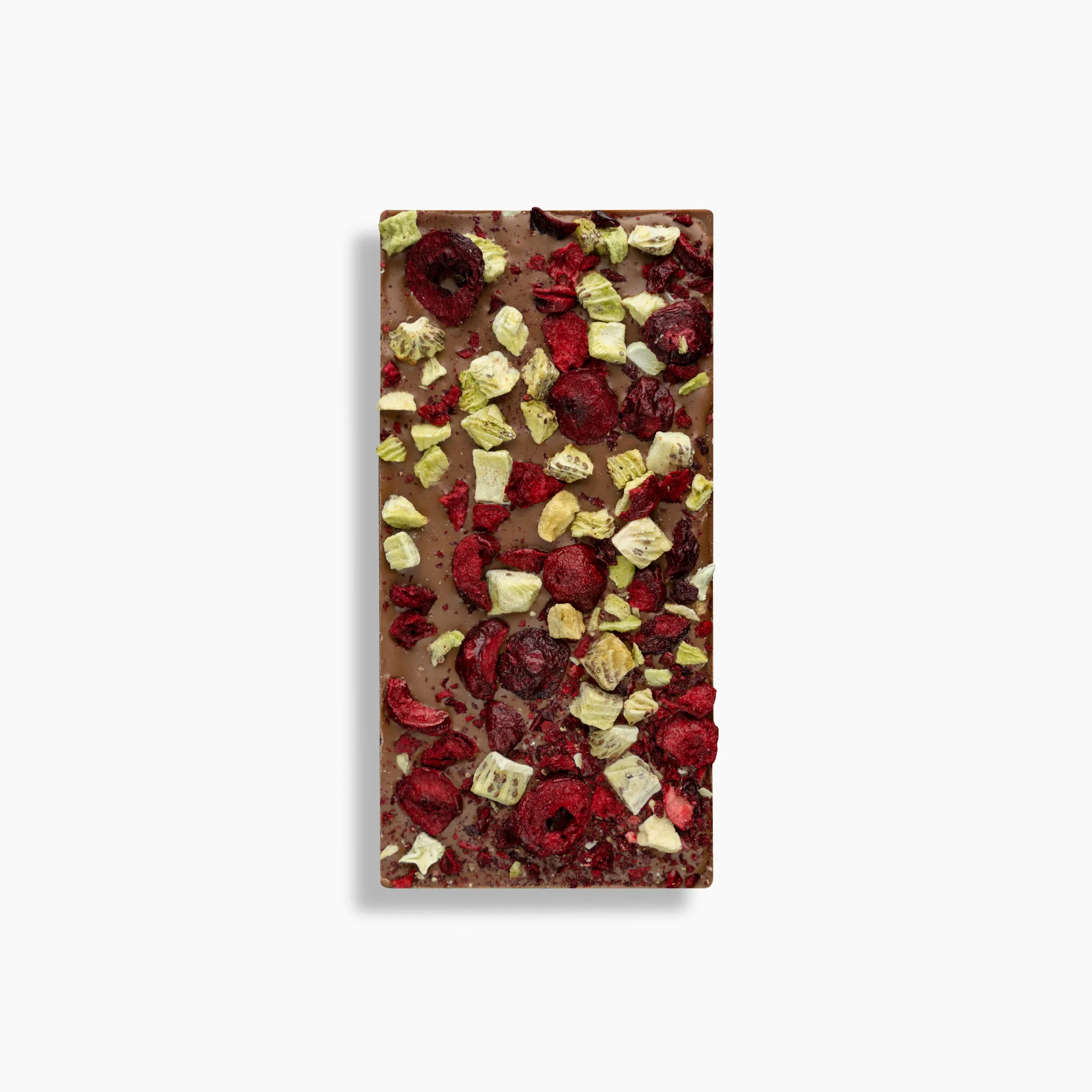 Zaskakujące połączenie soczystej dojrzewającej w słońcu wiśni z egzotycznym kiwi, to wszystko zatopione w wyjątkowo delikatnej mlecznej czekoladzie, która charakteryzuje się ciepłym kolorem i zrównoważonym smakiem ziarna kakaowego, mleka i karmelu.