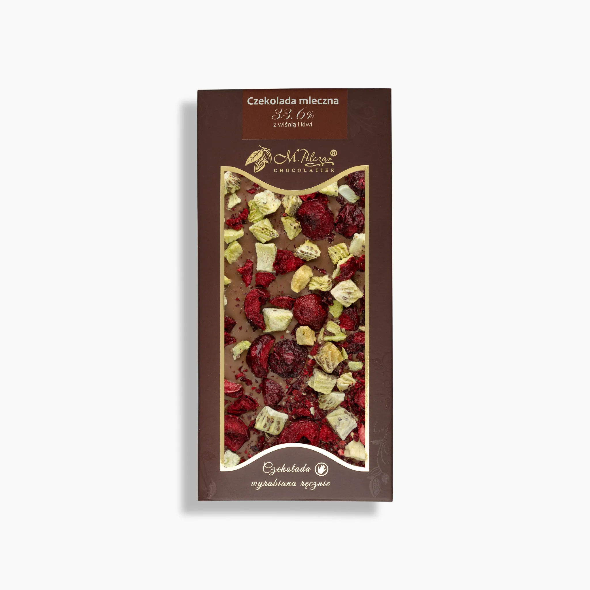 Składniki: czekolada mleczna (cukier, tłuszcz kakaowy, mleko pełne w proszku, miazga kakaowa, emulgator: lecytyna sojowa, naturalny aromat waniliowy), wiśnia liofilizowana 2,0%, kiwi liofilizowane 2,0%. Masa kakaowa minimum 33,4.%.