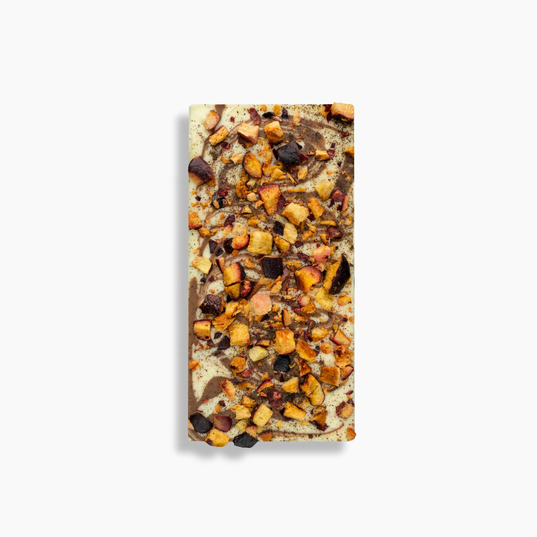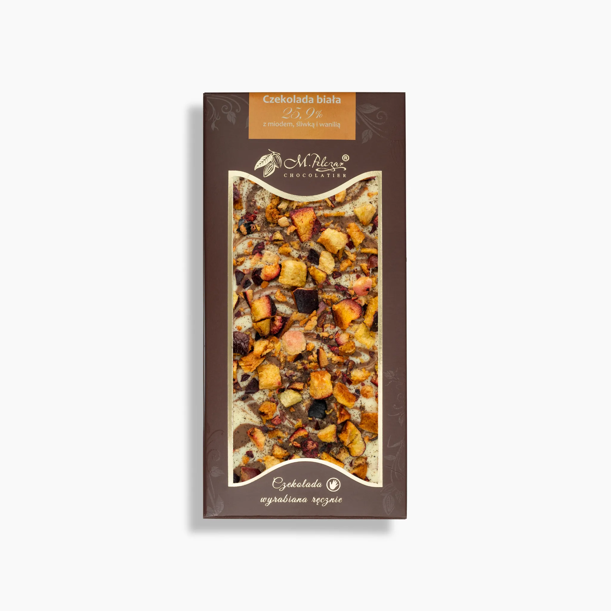 Świetne i zaskakujące połączenie aromatycznej czekolady miodowej, ze śliwką zatopioną w wyjątkowo mleczno-kremowej białej czekoladzie, całość została wzbogacona wanilią.