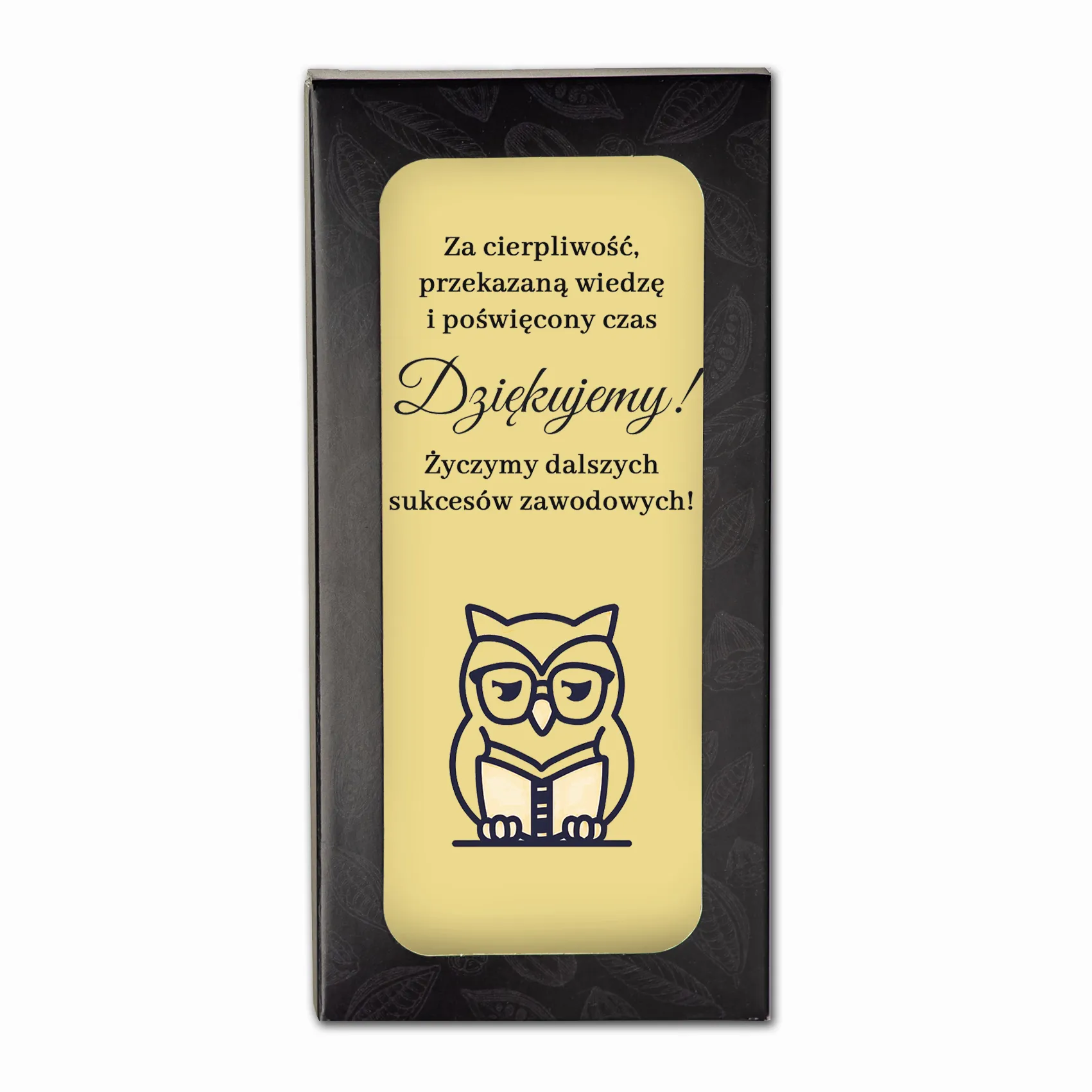 Składniki: czekolada biała (cukier, tłuszcz kakaowy, mleko pełne w proszku, emulgator: lecytyna sojowa, naturalny aromat waniliowy). Masa kakaowa minimum 25,9%.