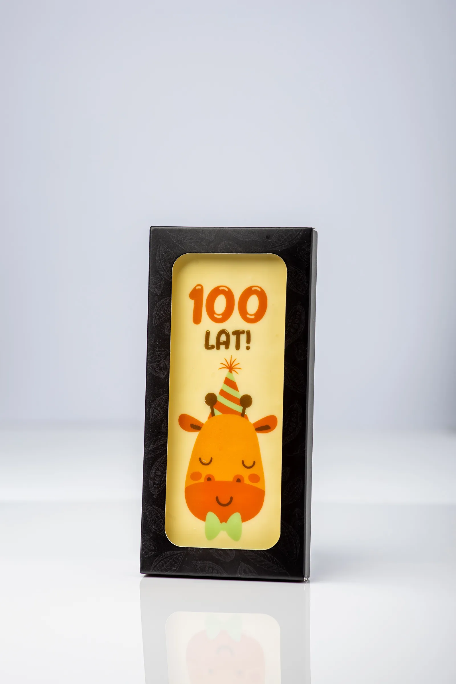 Czekolada z nadrukiem "100 LAT" to słodki i elegancki sposób, aby złożyć życzenia na urodziny. Wykonana z wyśmienitej czekolady, zachwyci smakiem i doda uroku każdemu prezentowi. Wyraź swoje życzenia w wyjątkowy sposób!