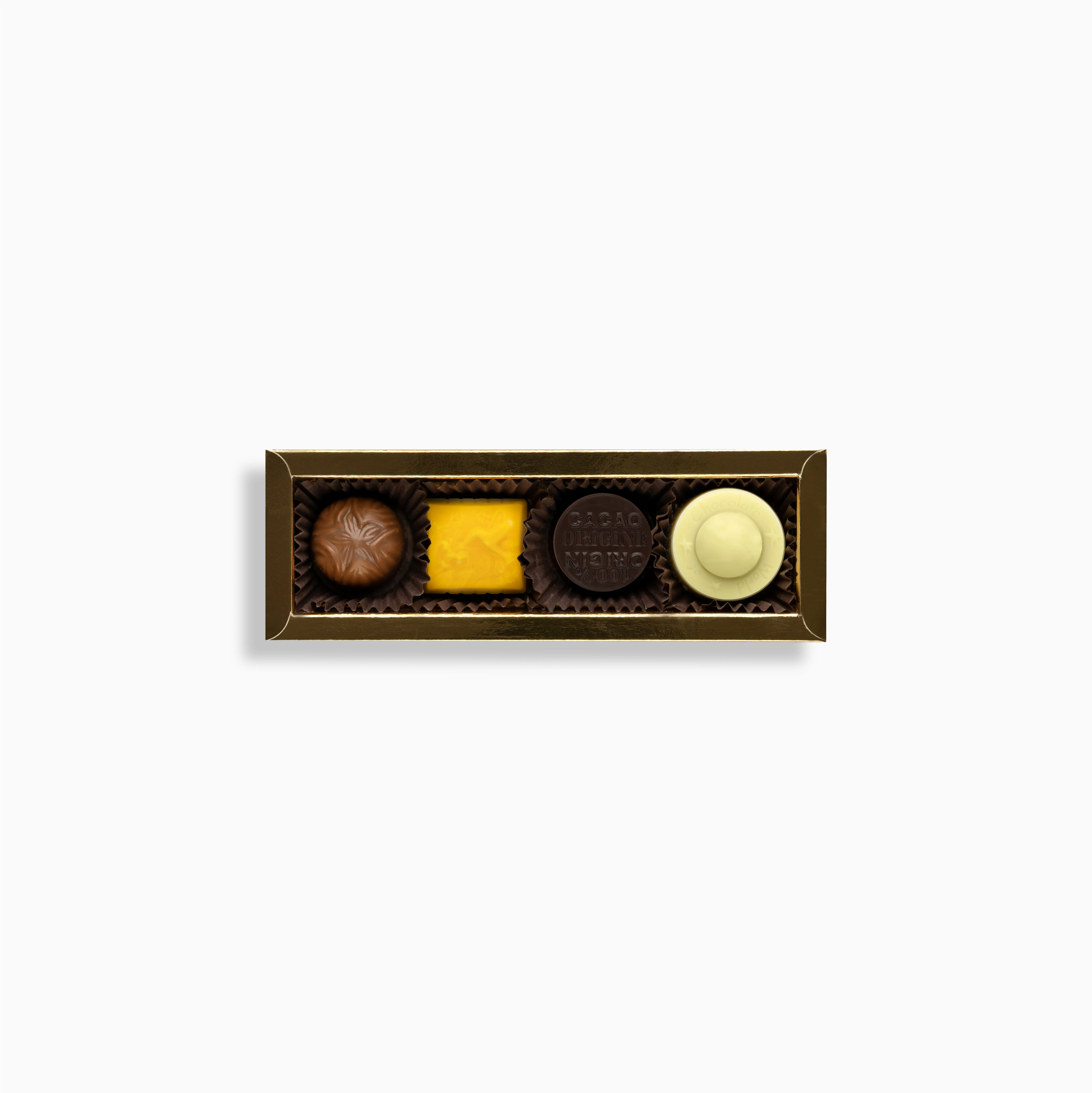 Wyśmienity a przy tym elegancki zestaw 4 wybornych pralin zapakowanych w ekskluzywne opakowanie przyozdobione wstążeczką.