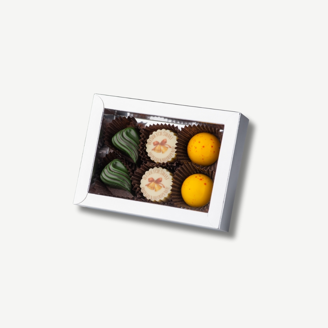 Wyśmienity a przy tym elegancki zestaw 6 wybornych pralin zapakowanych w ekskluzywne opakowanie przyozdobione wstążeczką.