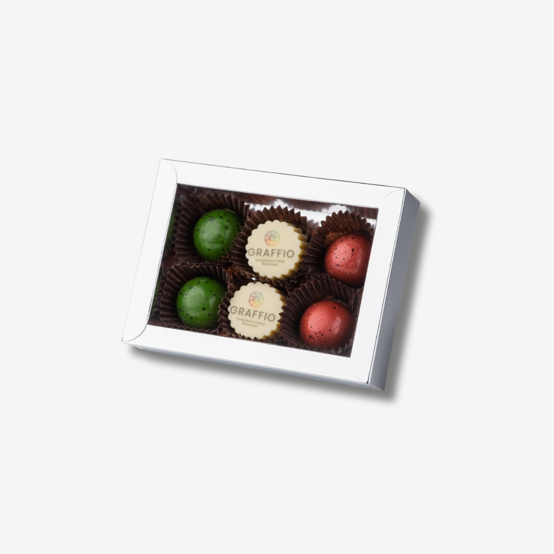 Wyśmienity a przy tym elegancki zestaw 6 wybornych pralin zapakowanych w ekskluzywne opakowanie przyozdobione wstążeczką.