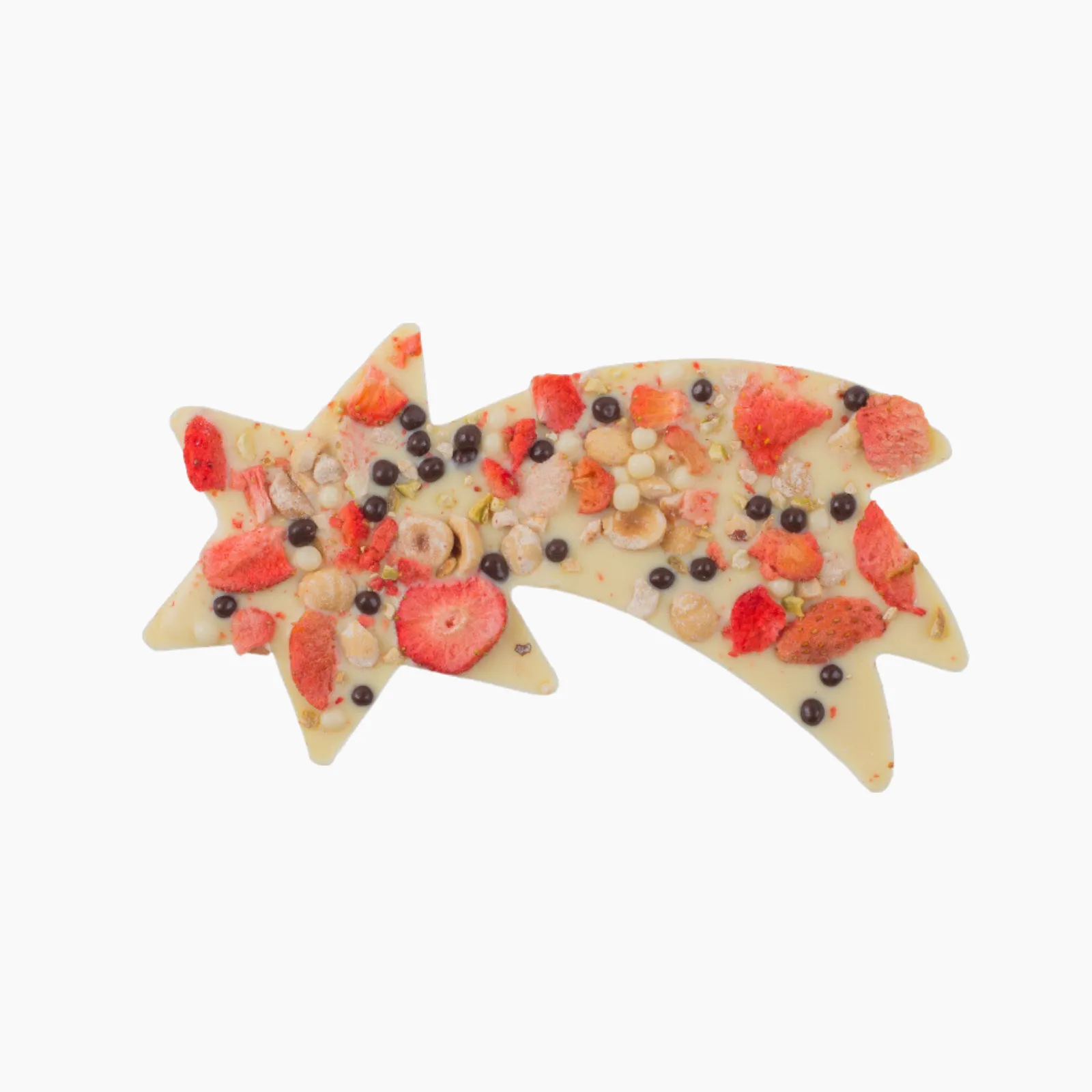 Gwiazda betlejemska z wyśmienitej białej czekolady z orzechami, pysznymi truskawkami i chrupiącymi kuleczkami czekoladowymi.