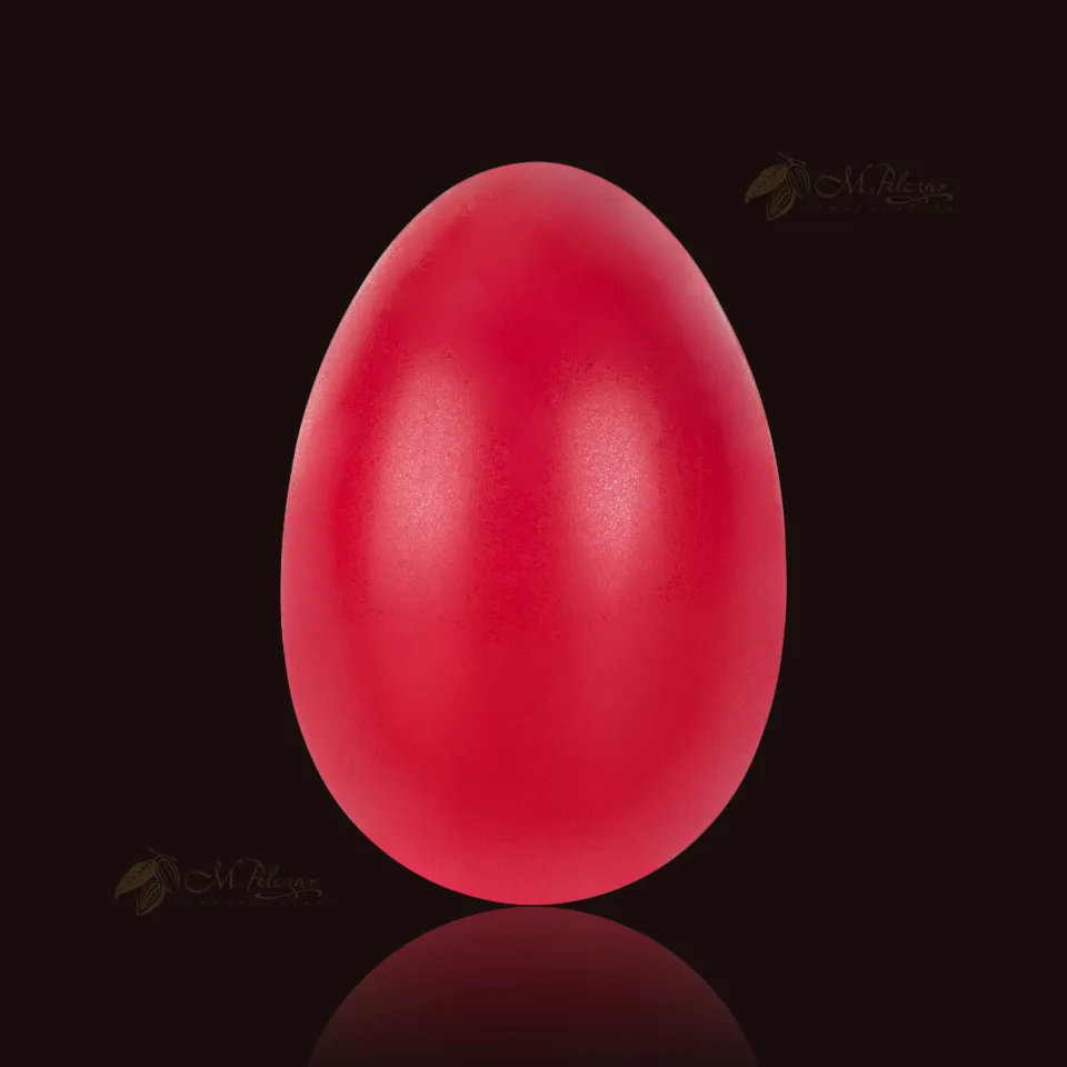 Średnie jajko z białej czekolady malowane barwnikiem spożywczym w odcieniu czerwonym. Idealnie nadaje się do dekoracji każdego stołu wielkanocnego. Jajko jest trójwymiarowe, umieszczone w przezroczystym opakowaniu dekorowane siankiem i przewiązane wstążką.