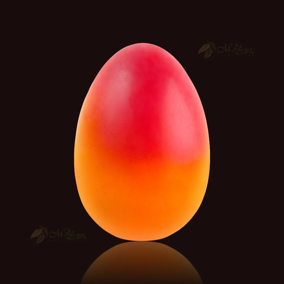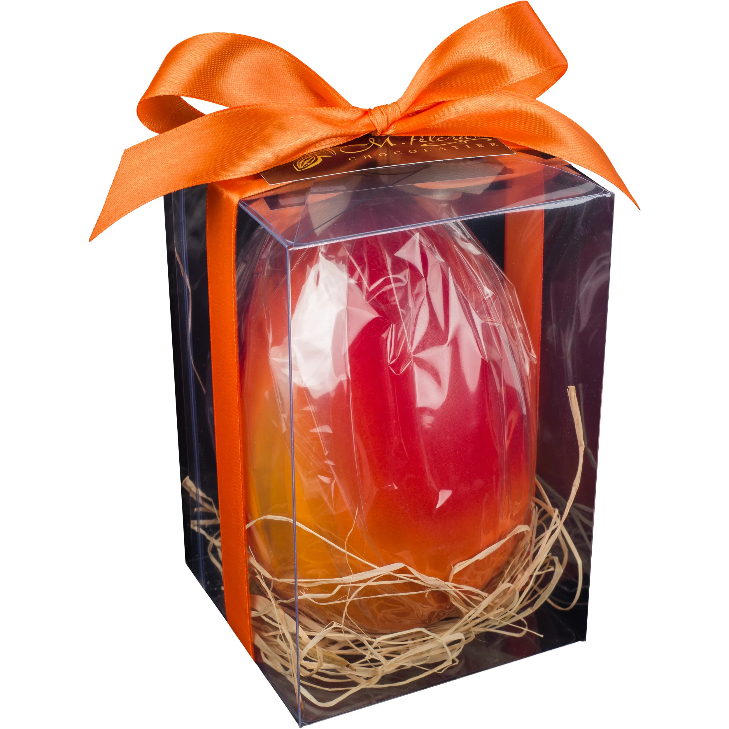 Średnie jajko z białej czekolady malowane barwnikiem spożywczym w odcieniu żółto-czerwonym. Idealnie nadaje się do dekoracji każdego stołu wielkanocnego. Jajko jest trójwymiarowe, umieszczone w przezroczystym opakowaniu dekorowane siankiem i przewiązane wstążką.