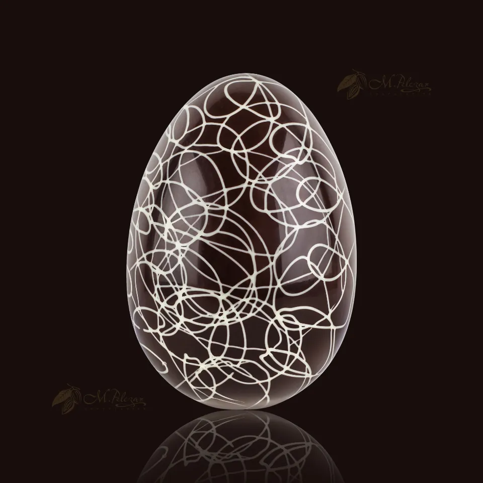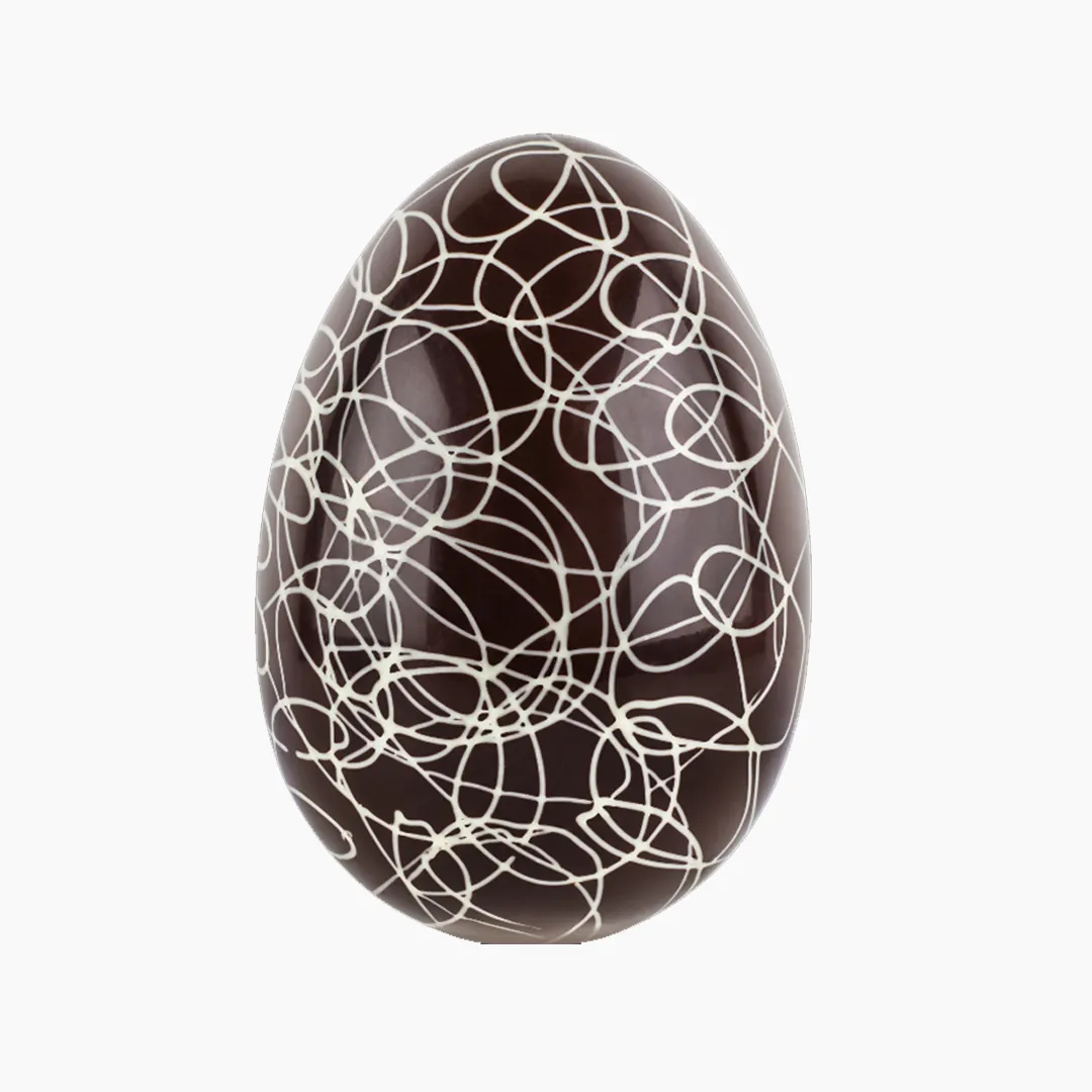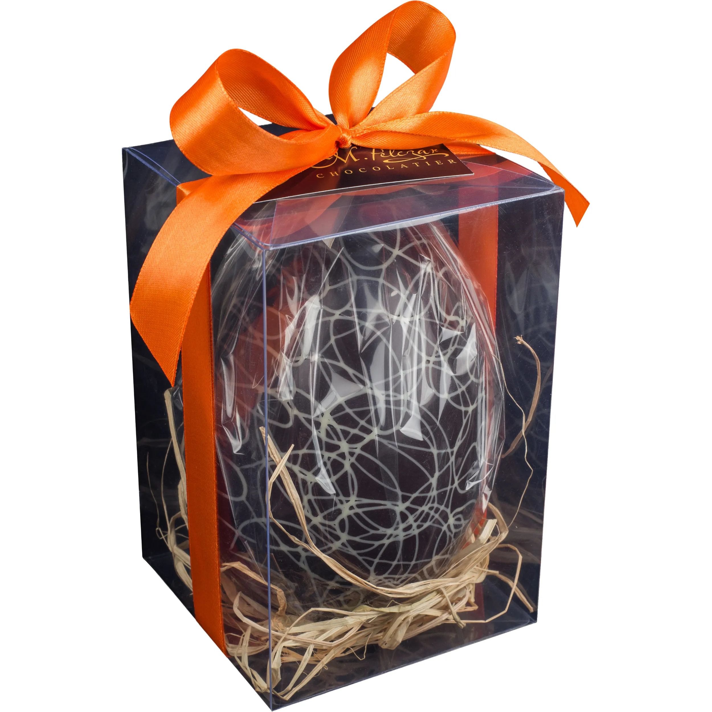 Średnie jajko z gorzkiej czekolady malowane ręcznie we wzorki białą czekoladą. Idealnie nadaje się do dekoracji każdego stołu wielkanocnego. Jajko jest trójwymiarowe, umieszczone w przezroczystym opakowaniu dekorowane siankiem i przewiązane wstążką.