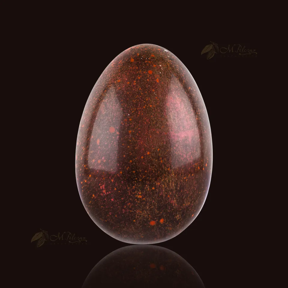 Średnie jajko z gorzkiej czekolady, dekorowane barwnikiem spożywczym w odcieniu czerwonym. Idealnie nadaje się do dekoracji każdego stołu wielkanocnego. Jajko jest trójwymiarowe, umieszczone w przezroczystym opakowaniu dekorowane siankiem i przewiązane wstążką.