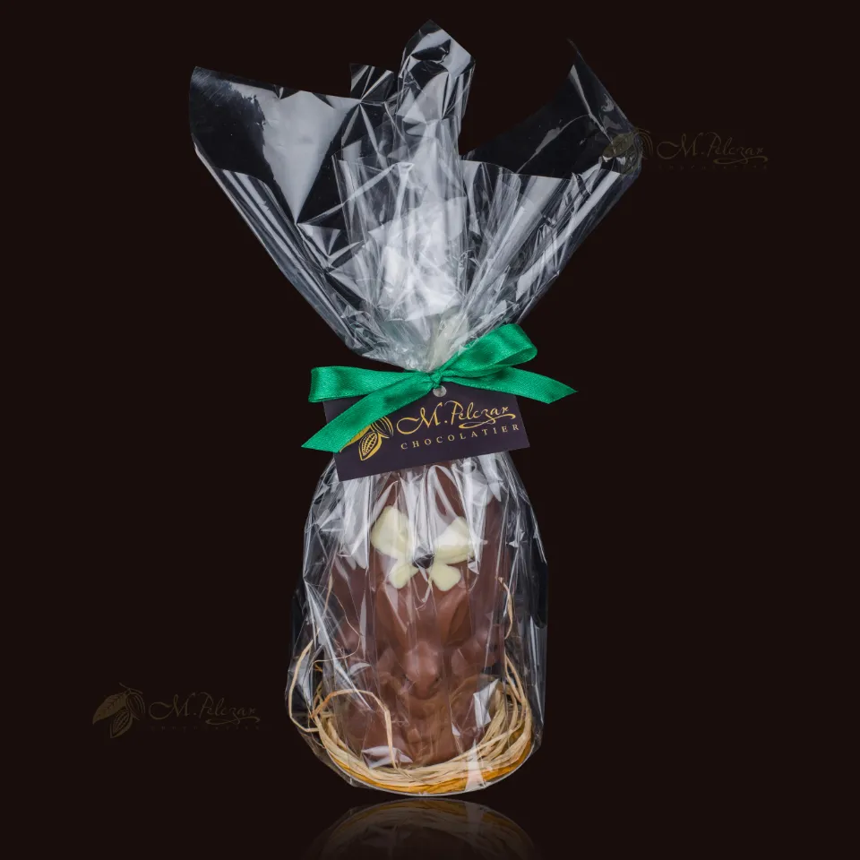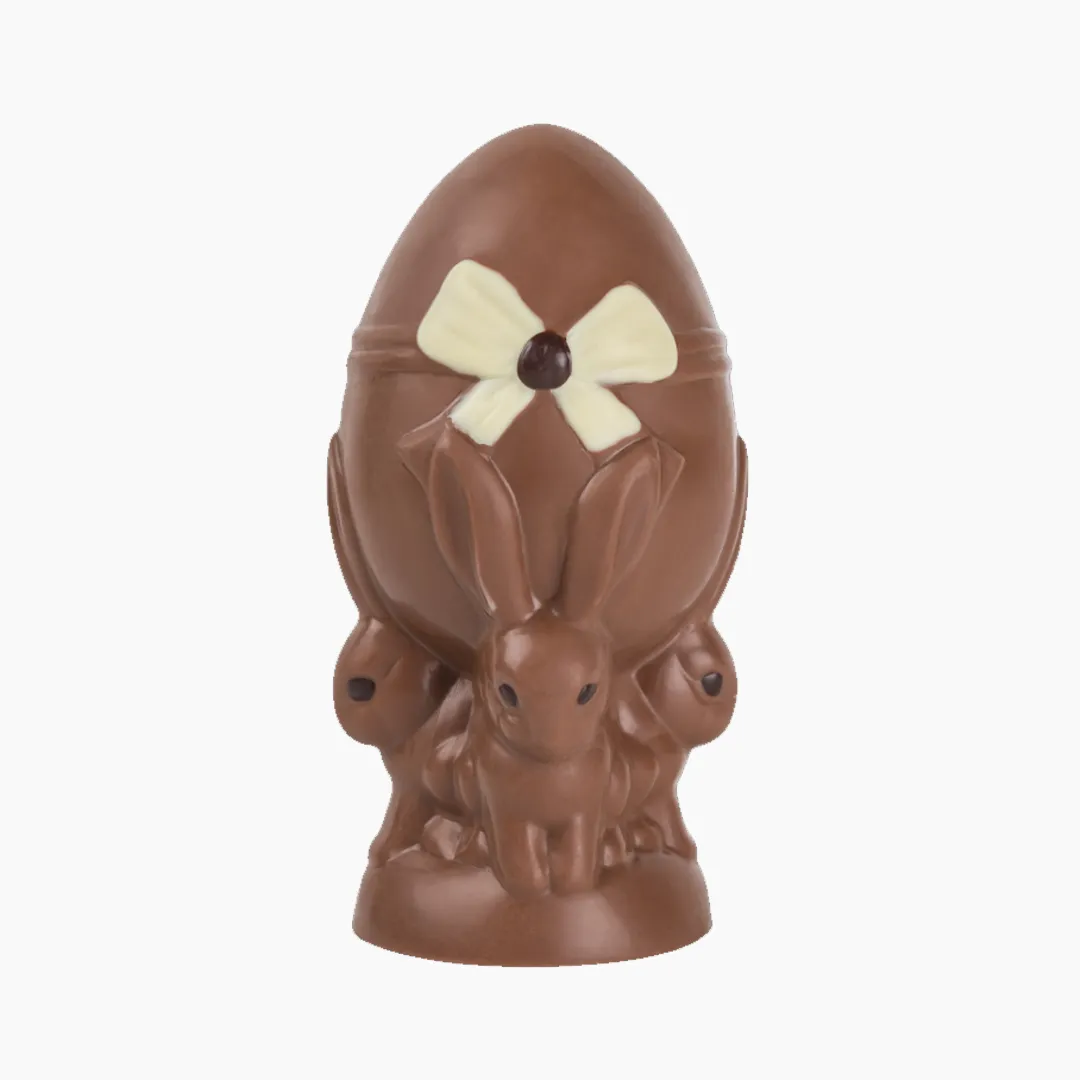 Jajko z zajączkami wykonane z pysznej mlecznej czekolady, dekorowane białą i gorzką czekoladą. Wspaniały słodki akcent na stole wielkanocnym. Figurka jest trójwymiarowa, umieszczona w przezroczystej, dekoracyjnej folii i przewiązana wstążką.