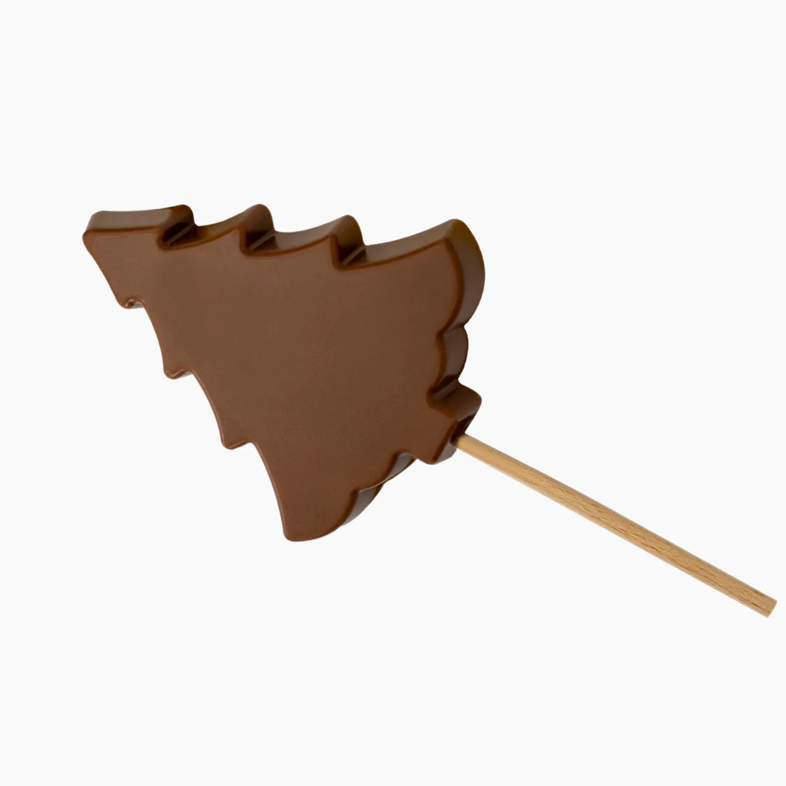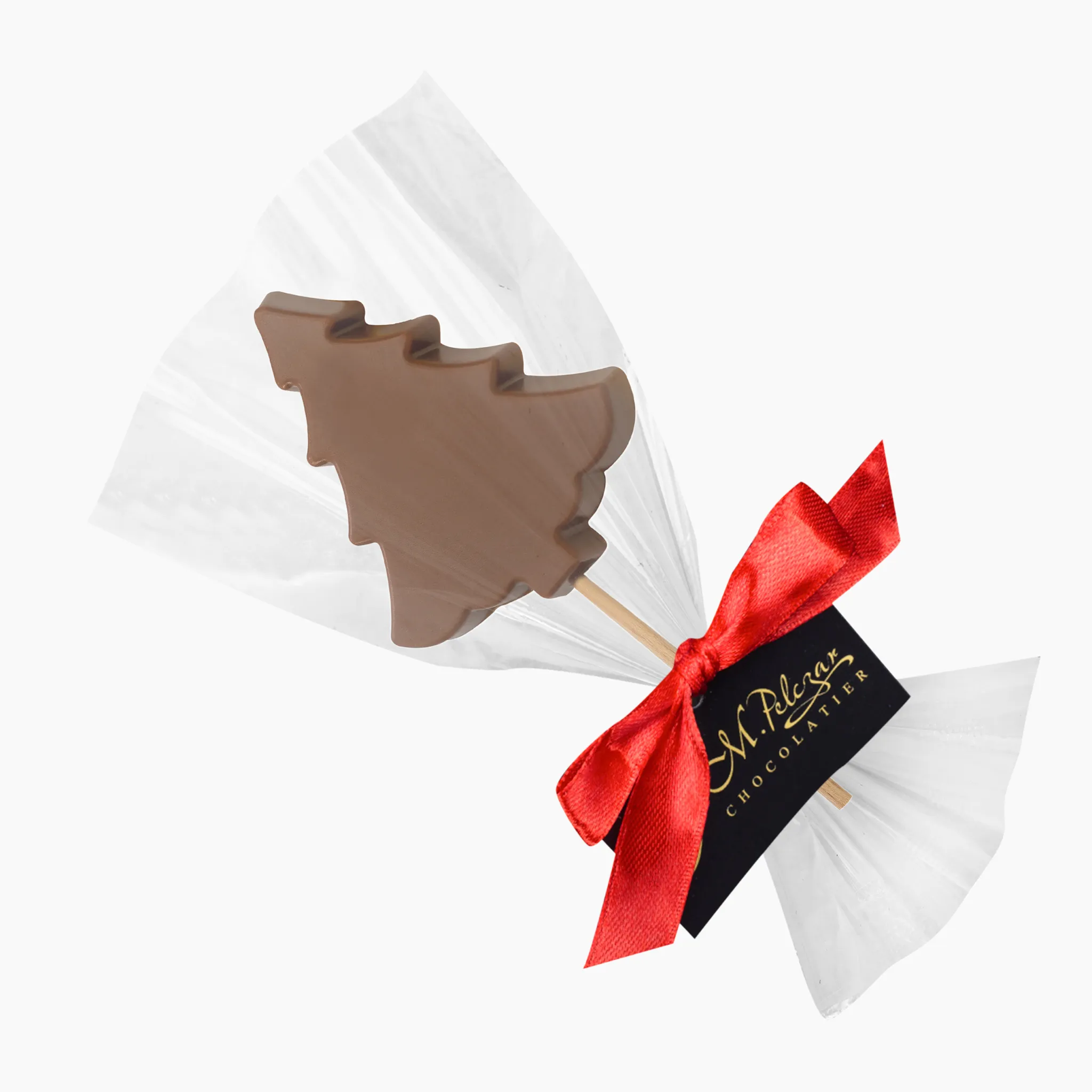 Lizak choinka z mlecznej czekolady, zapakowany w woreczek przezroczysty przewiązany wstążką.