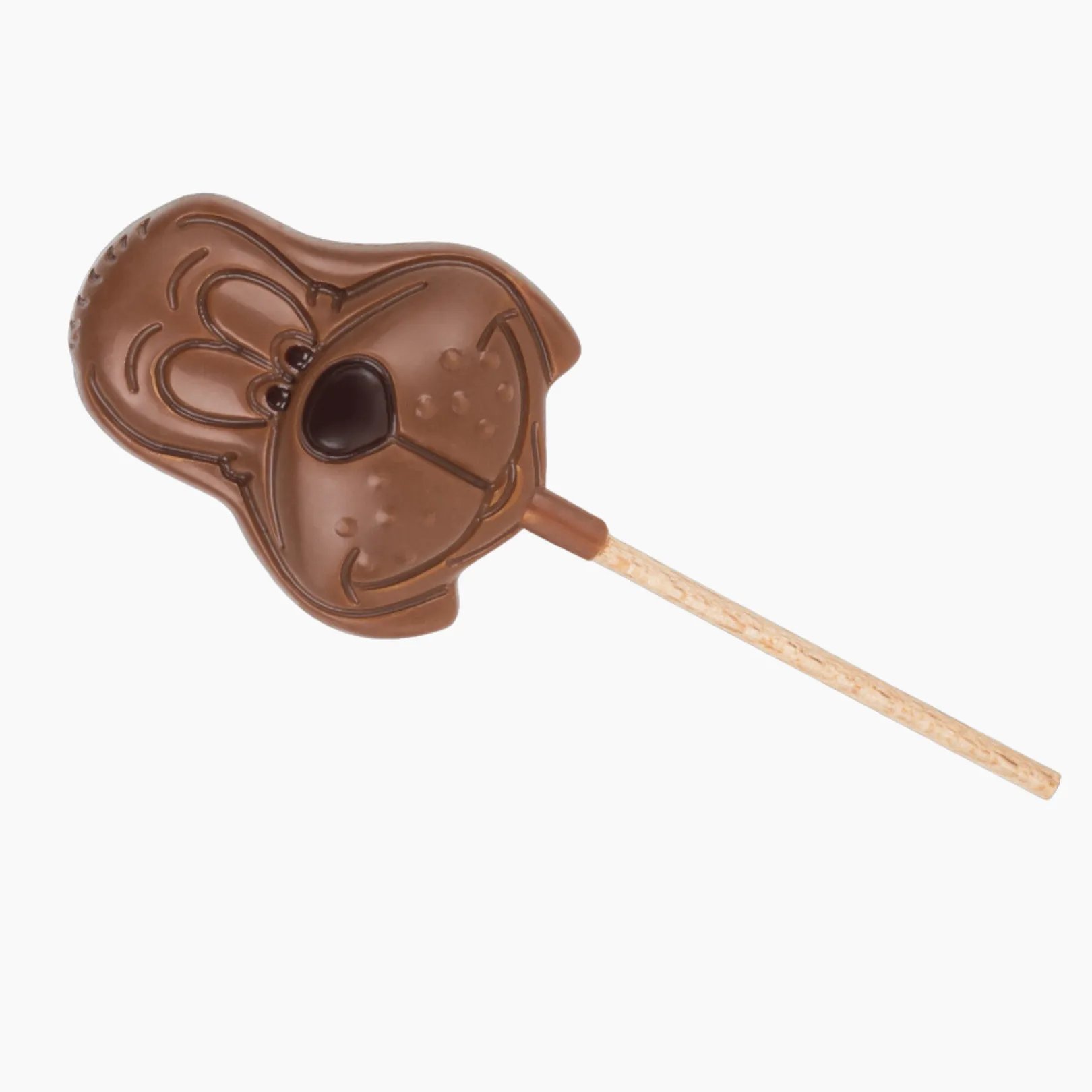 Lizak Piesek wykonany z mlecznej czekolady, dekorowany gorzką czekoladą.