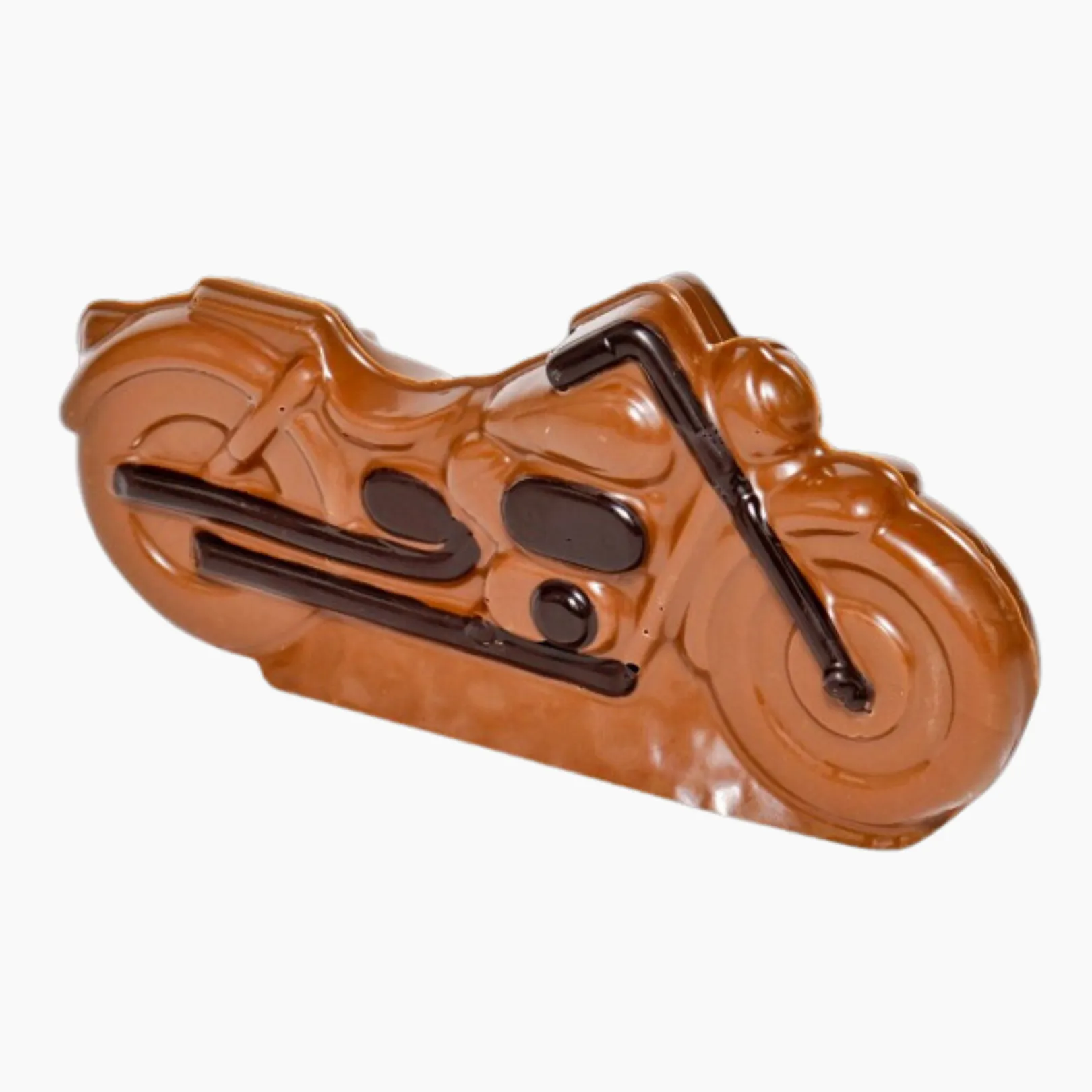 Wspaniały, przypominający wyglądem prawdziwy motocykl, wykonany z mlecznej i gorzkiej czekolady. Zapakowany w przeźroczysty celofan i przyozdobiony wstążeczką.
