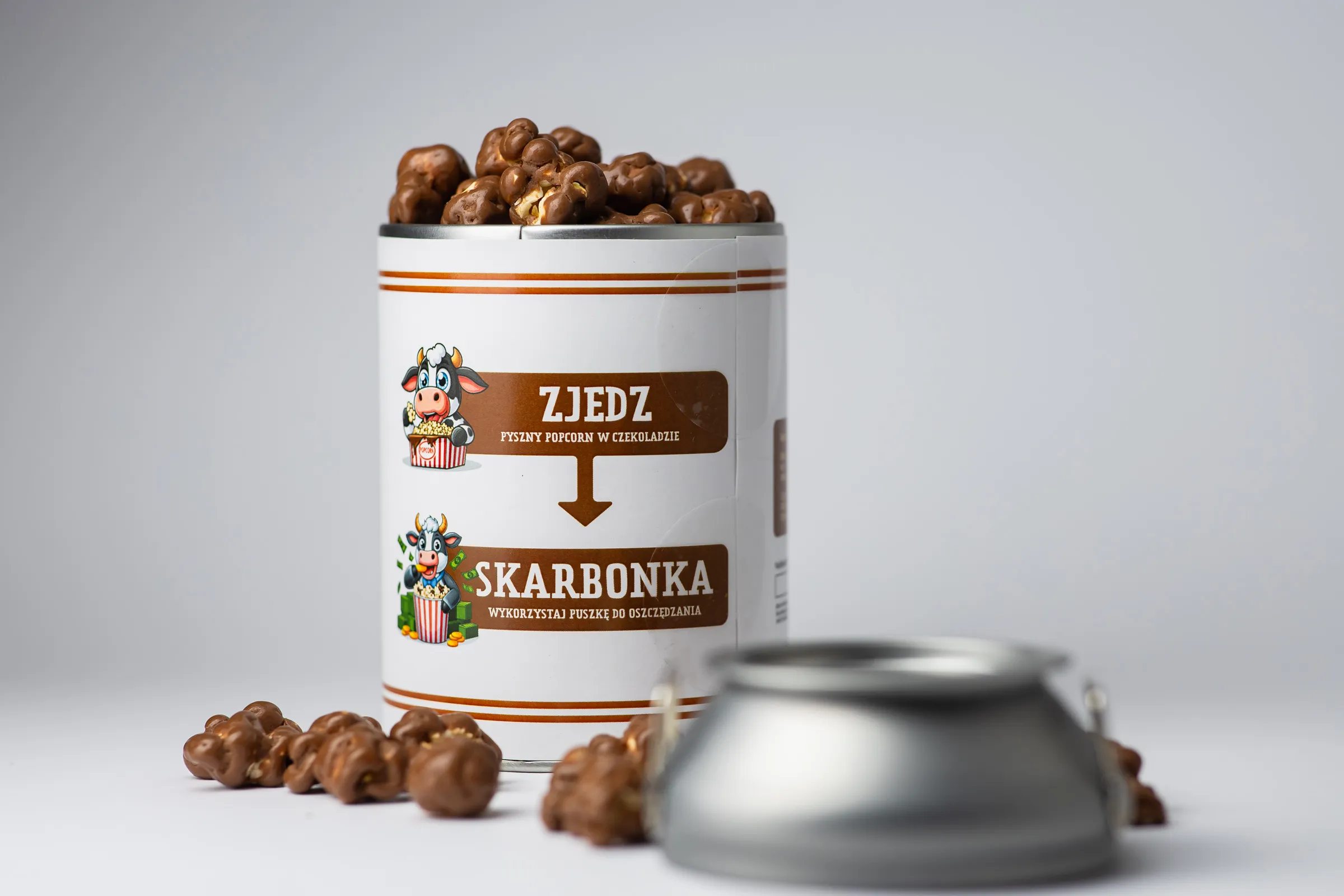 Opakowanie w formie skarbonki dodaje produktowi nie tylko uroku, ale także funkcjonalności - po zakończeniu jedzenia popcornu można wykorzystać je jako oryginalną skarbonkę.