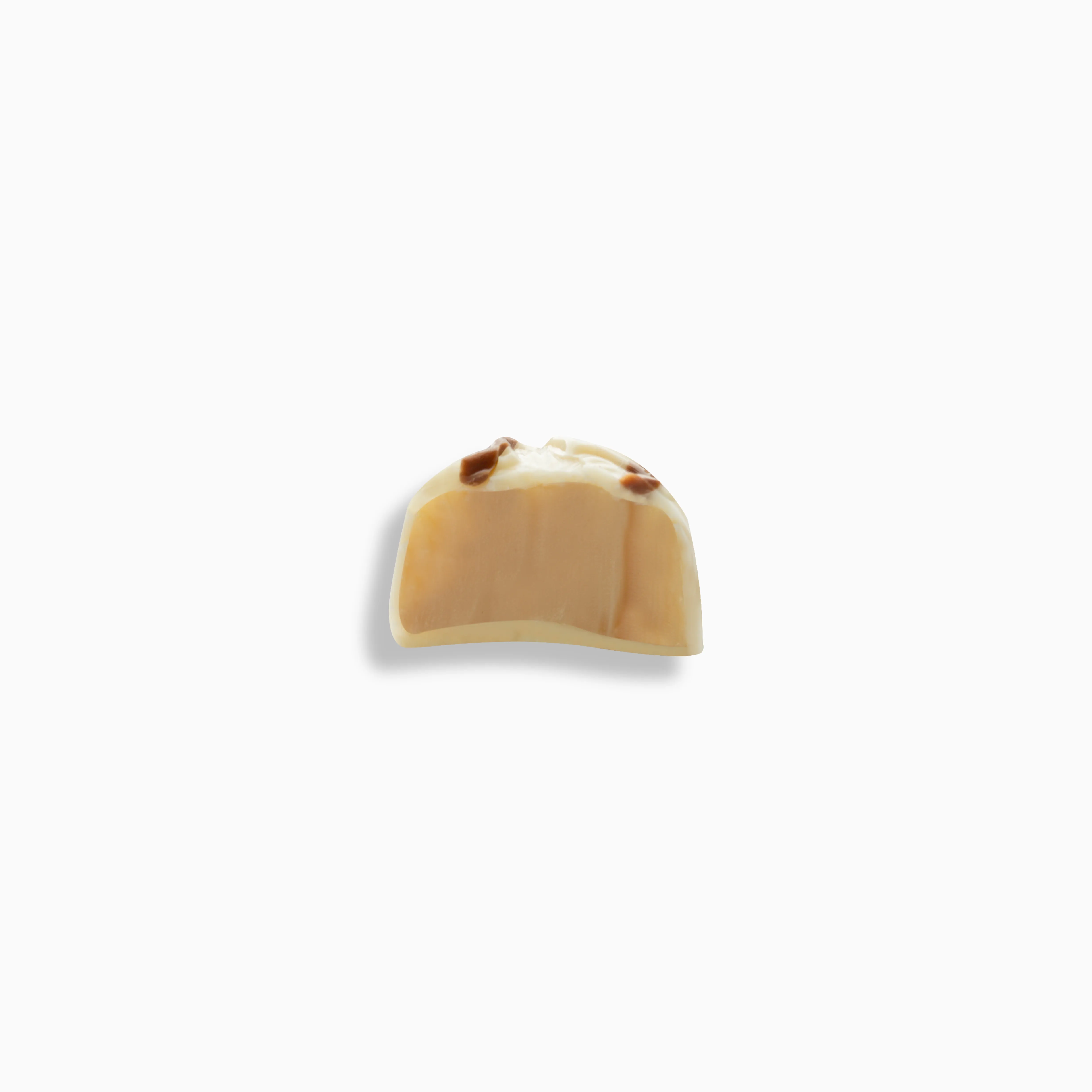 Mleczne nadzienie o smaku orzecha włoskiego z orzechem w środku, zamknięte w białej czekoladzie, dekorowane paseczkami z mlecznej czekolady.