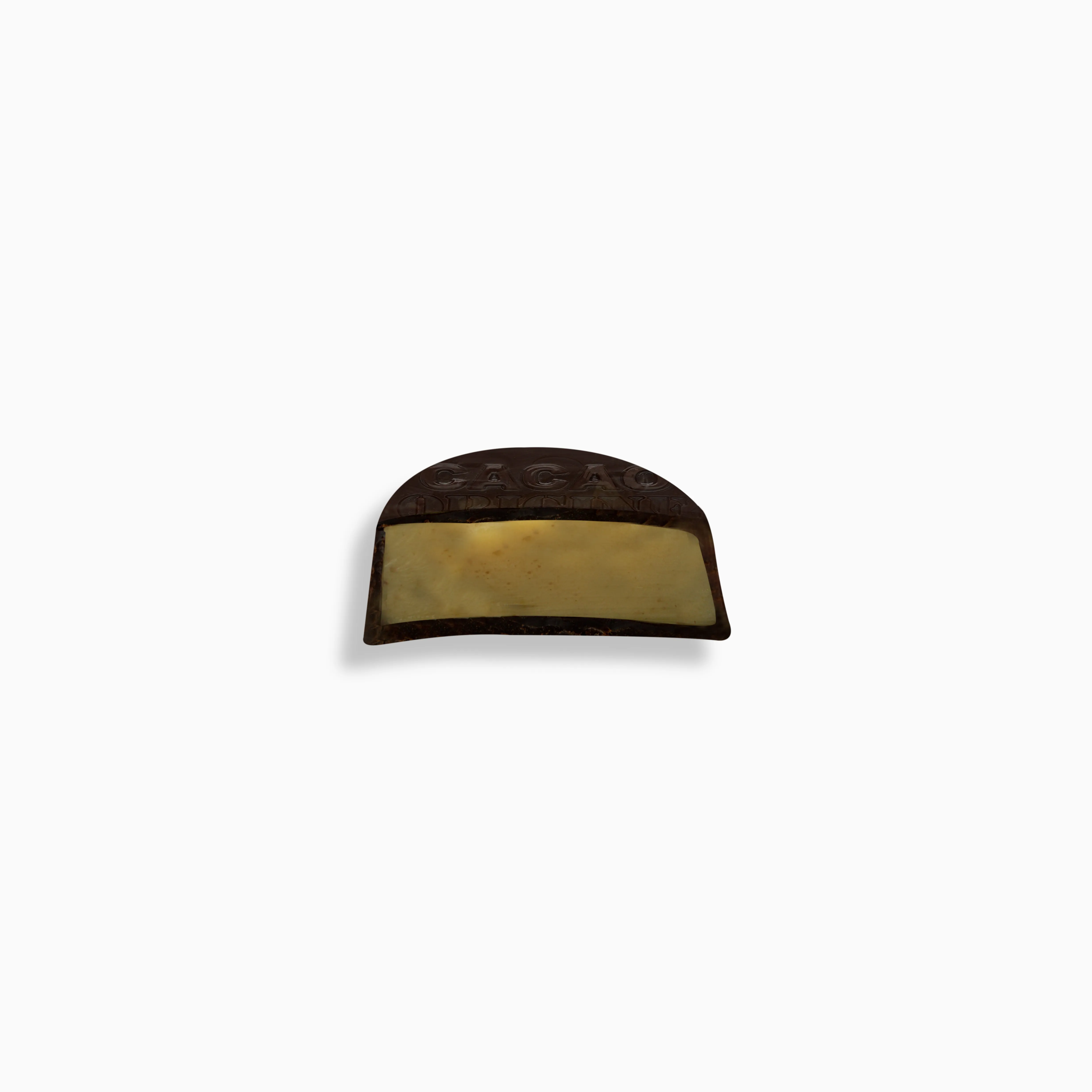 Intensywne nadzienie pistacjowe z kawałkami pistacji, zamknięte w gorzkiej czekoladzie.