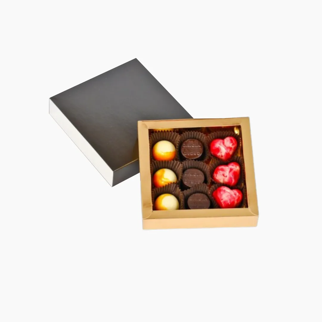 9 ręcznie robionych pralinek w różnych smakach i kształtach, które zachwycą Waszych gości weselnych. Czekoladki zapakowane zostały w eleganckie pudełko.