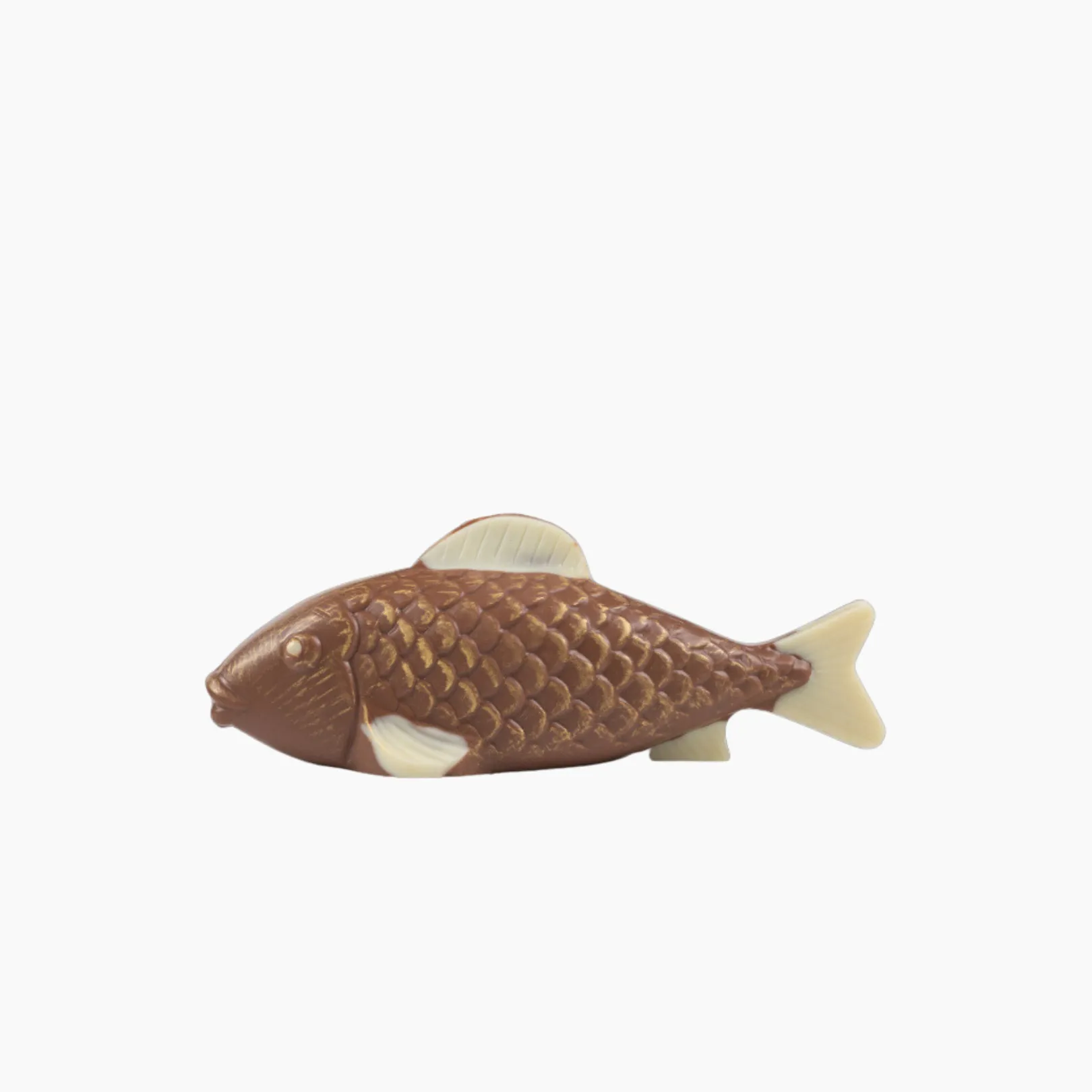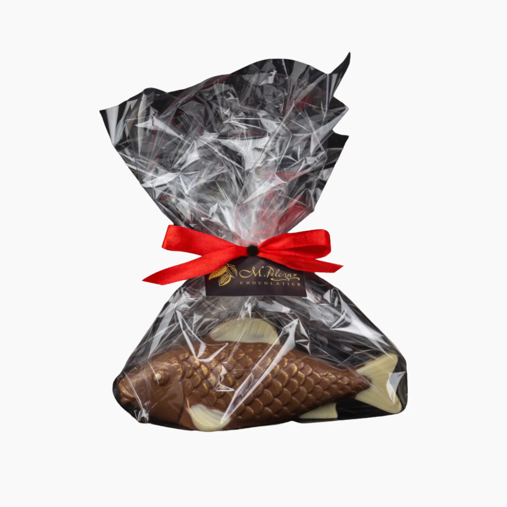 Rybka z czekolady, idealna na prezent dla wędkarza, miłośników ryb, morza i nie tylko. Rybka została wykonana z najwyższej jakości mlecznej i białej czekolady a całość została zapakowana w przeźroczysty celofan owinięty wstążeczką.