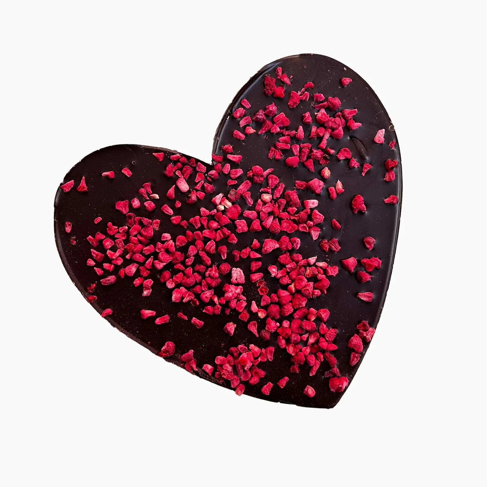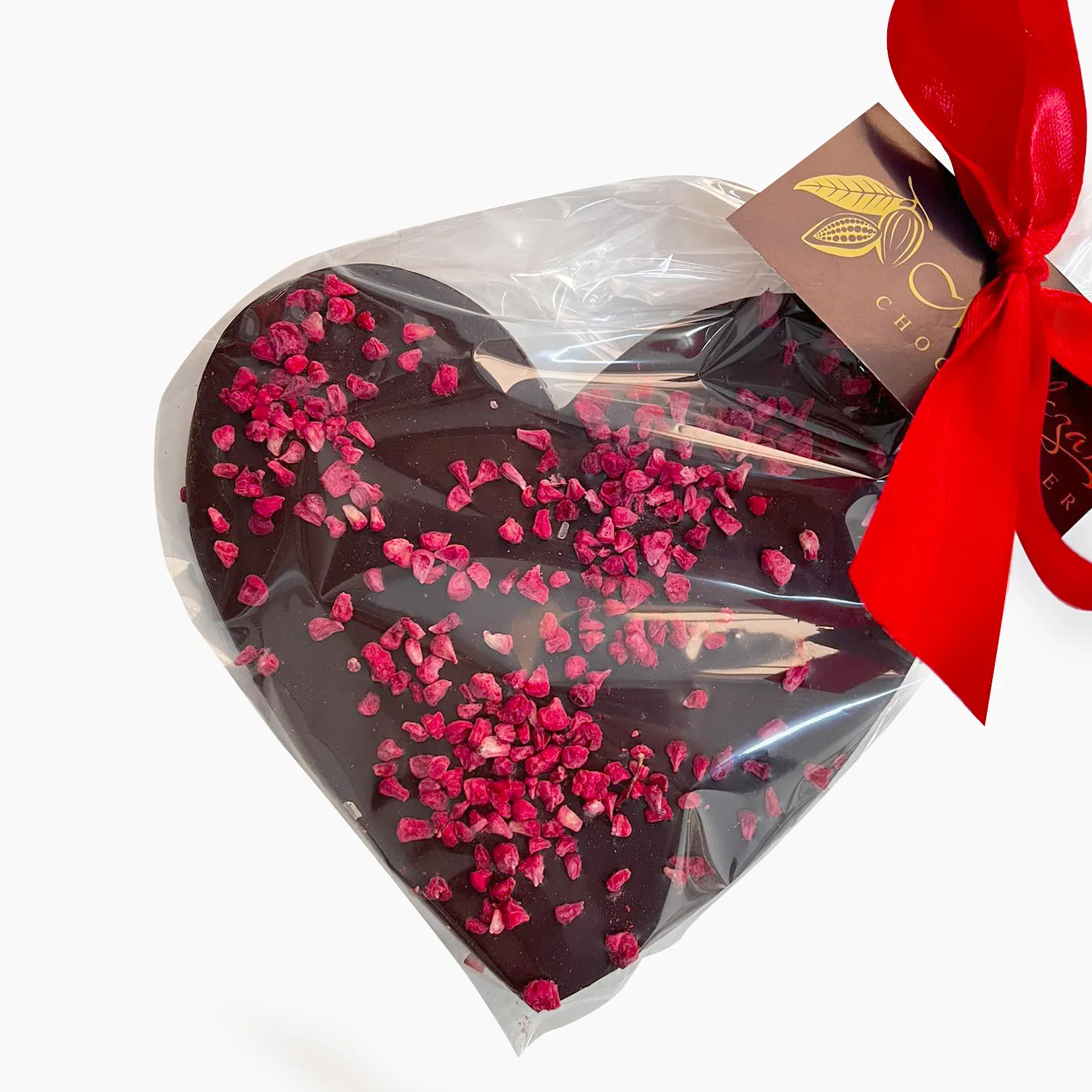 Wspaniałe walentynkowe serce z pysznej gorzkiej czekolady, dekorowane malinami.