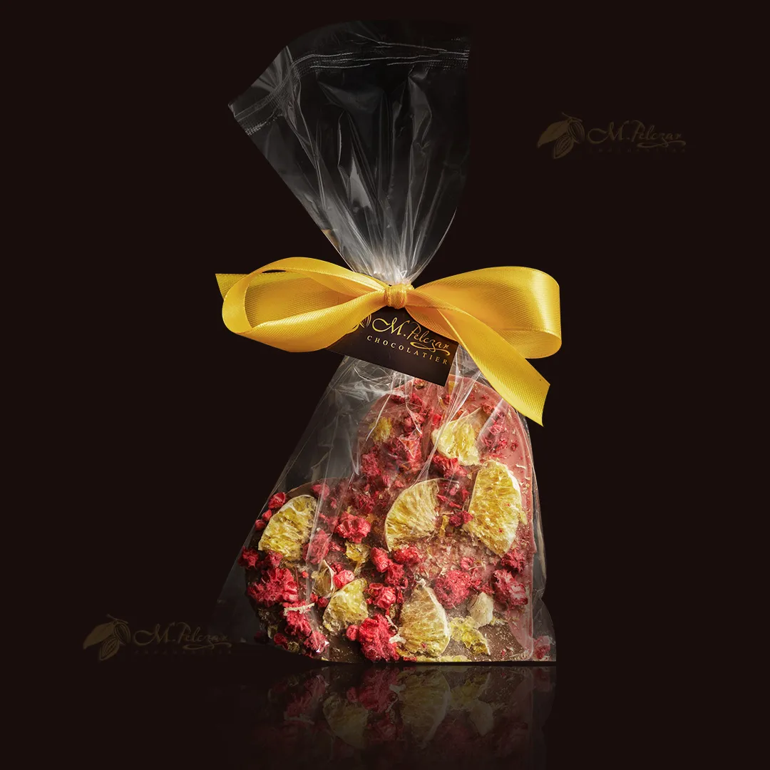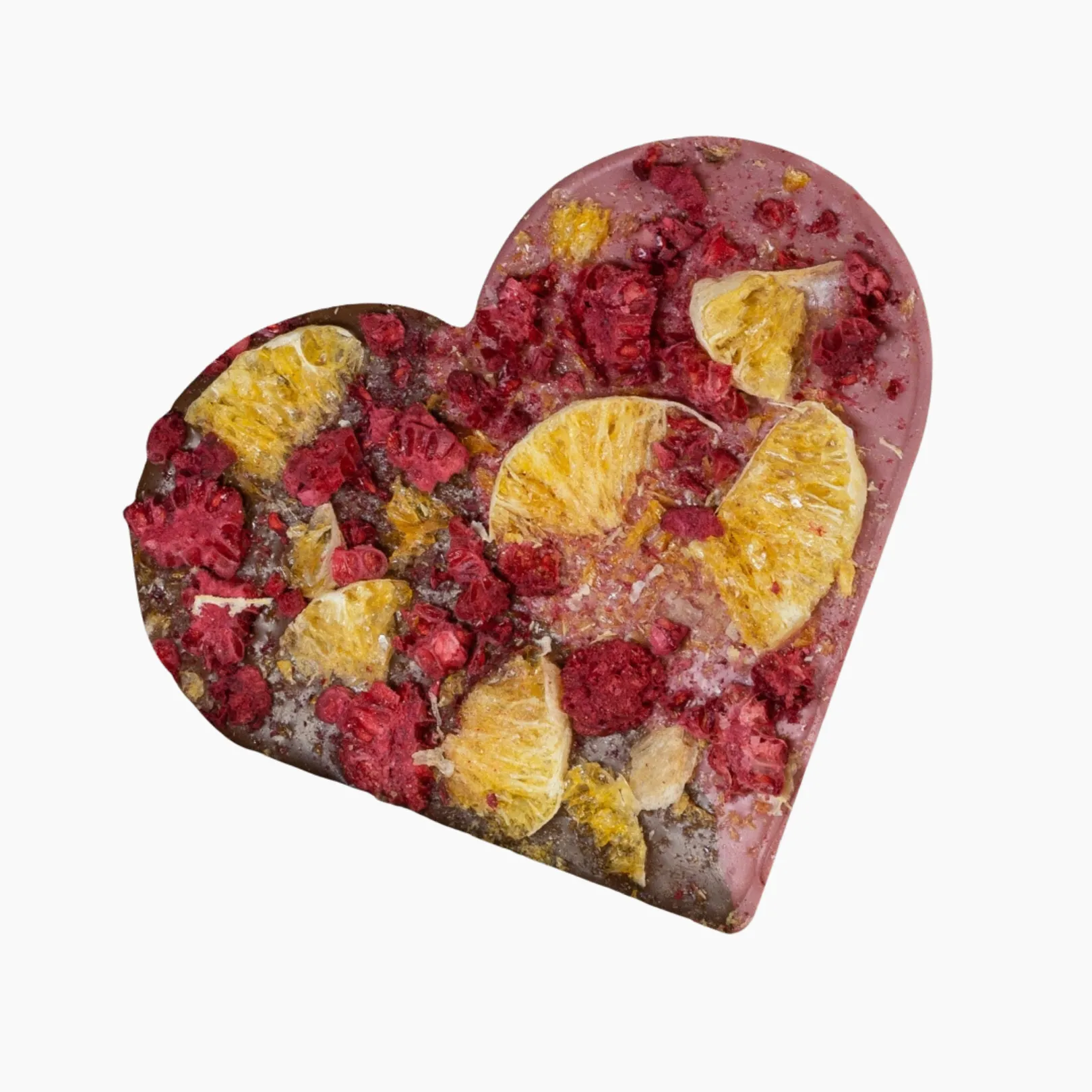Serce z mlecznej i różowej czekolady z maliną i mandarynkami 90gSerce z mlecznej i różowej czekolady z maliną i mandarynkami 90g