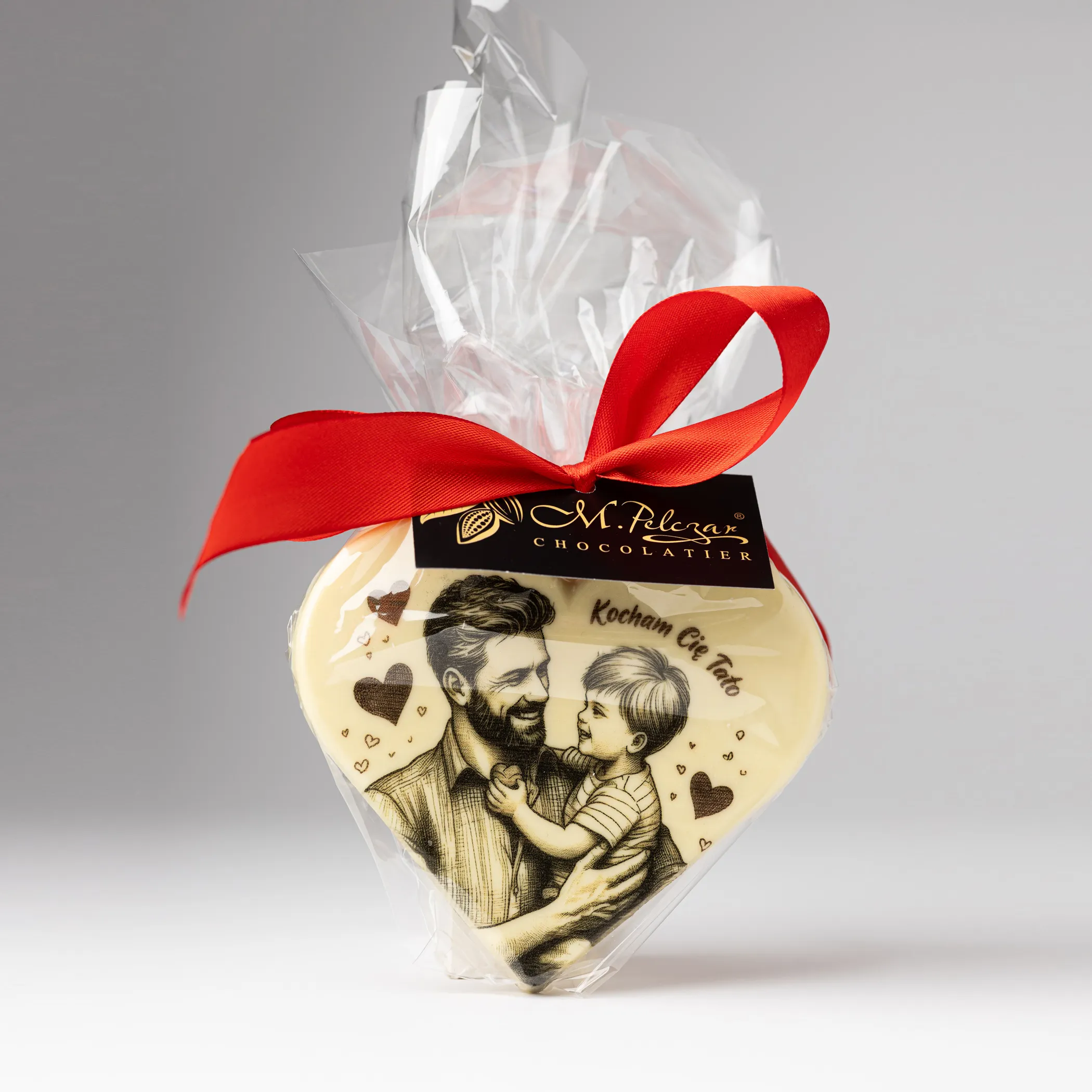 Składniki: czekolada biała (cukier, tłuszcz kakaowy, mleko pełne w proszku, emulgator: lecytyna sojowa, naturalny aromat waniliowy). Masa kakaowa minimum 25,9%.