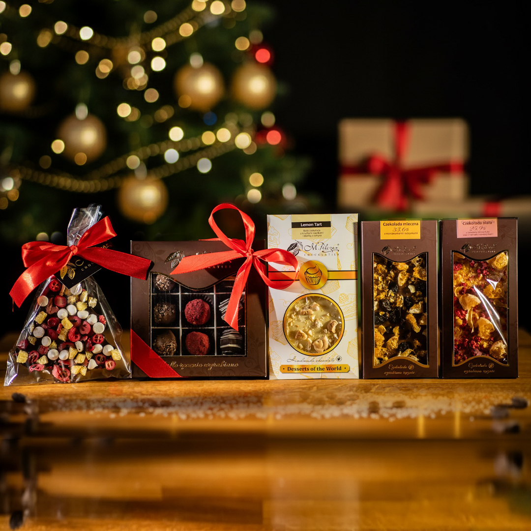 Centralnym punktem jest majestatyczna choinka, odlana z intensywnej, gorzkiej czekolady. Jej szlachetny smak i piękna forma to świąteczna dekoracja stołu i wykwintny deser w jednym.