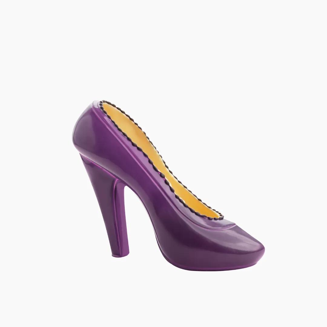 Ekskluzywny prezent dla wyjątkowej kobiety. Szpilka wykonana z białej czekolady o soczystym fioletowym kolorze. Bucik zapakowany w przezroczyste opakowanie i przewiązany wstążką.