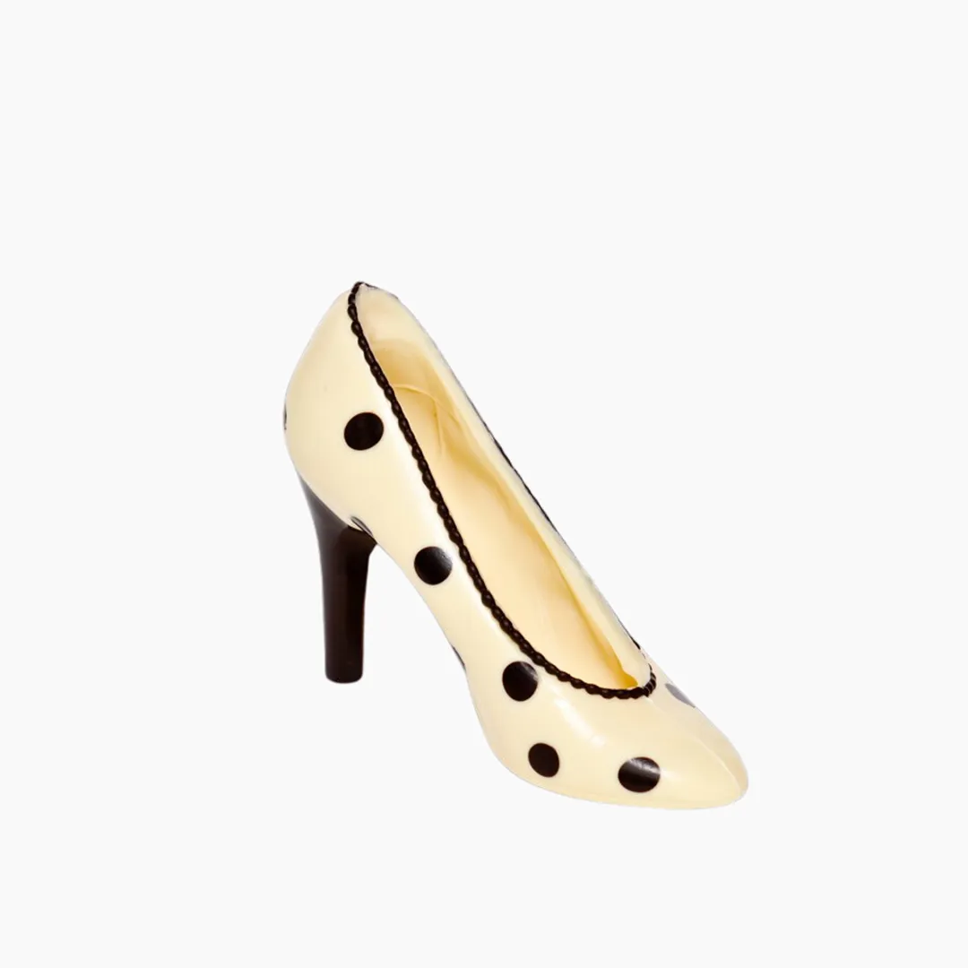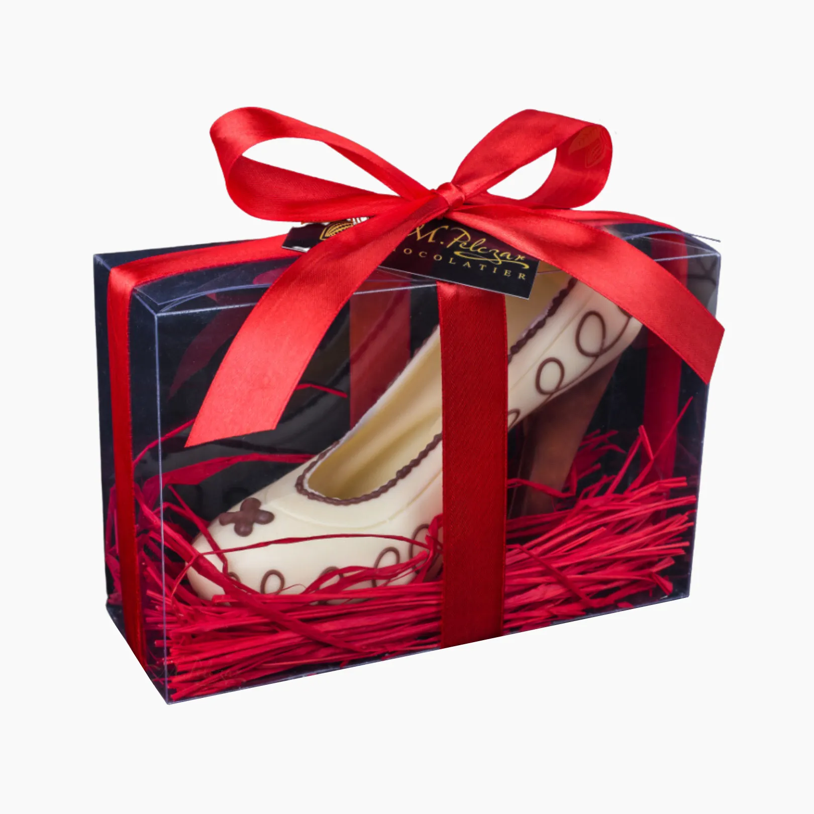Wyrafinowany prezent dla wyjątkowej kobiety. Szpilka wykonana z białej czekolady i przyozdobiona ciemnymi grochami. Bucik zapakowany w przezroczyste opakowanie i przewiązany wstążką.