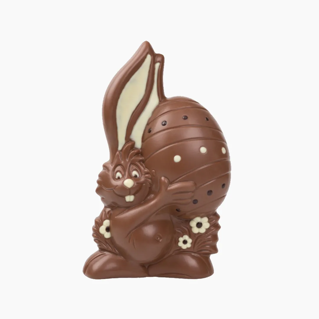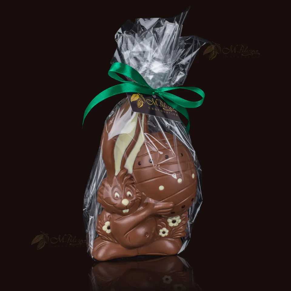 Zając z jajkiem wykonany z pysznej mlecznej czekolady, dekorowany białą i gorzką czekoladą. Wspaniały słodki akcent na stole wielkanocnym. Figurka jest trójwymiarowa, umieszczona w przezroczystej, dekoracyjnej folii i przewiązana wstążką.
