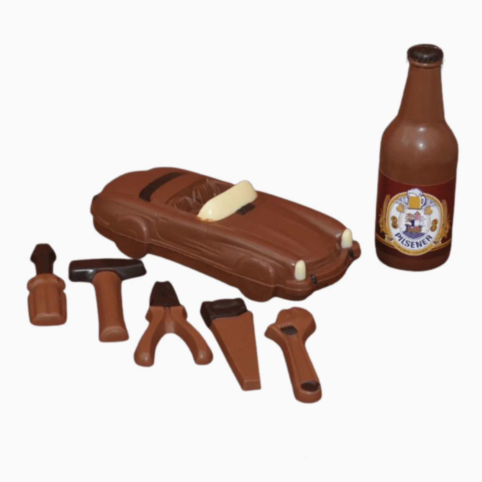 Zestaw zawiera: butelke piwa, samochód i zestaw narzędzi, całość zapakowana w przeźroczysty celofan i przyozdobiona wstążeczką.