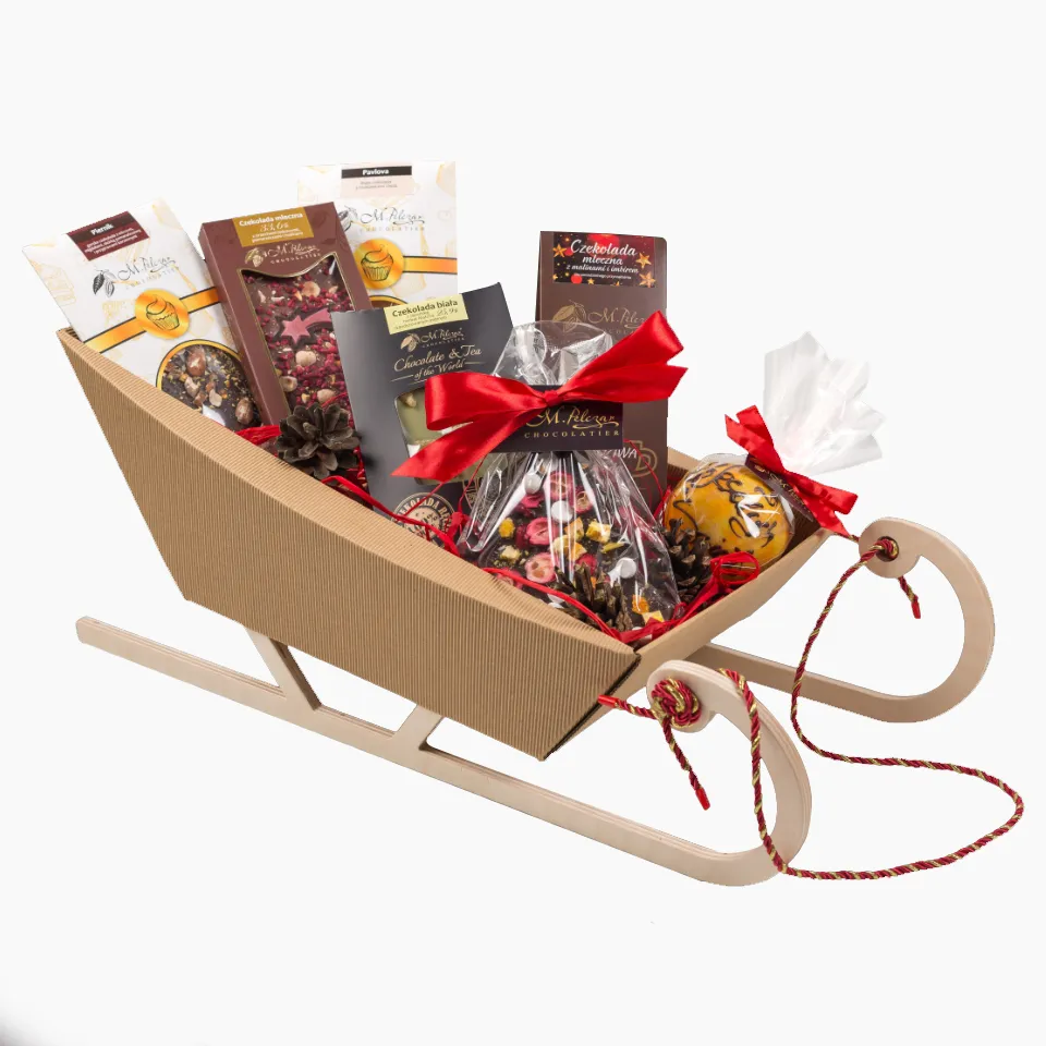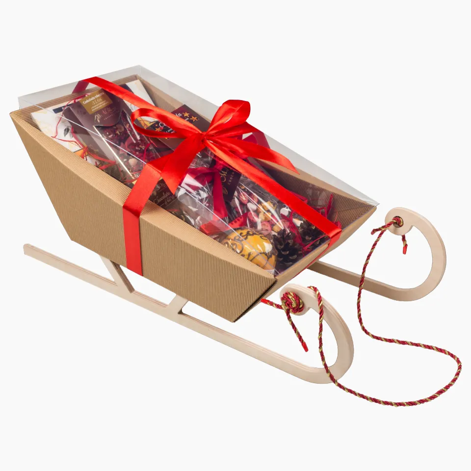 Zestaw zapakowany w tekturowe sanie z drewnianymi płozami, na wierzchu przezroczysta osłona, zestaw przewiązany wstążką