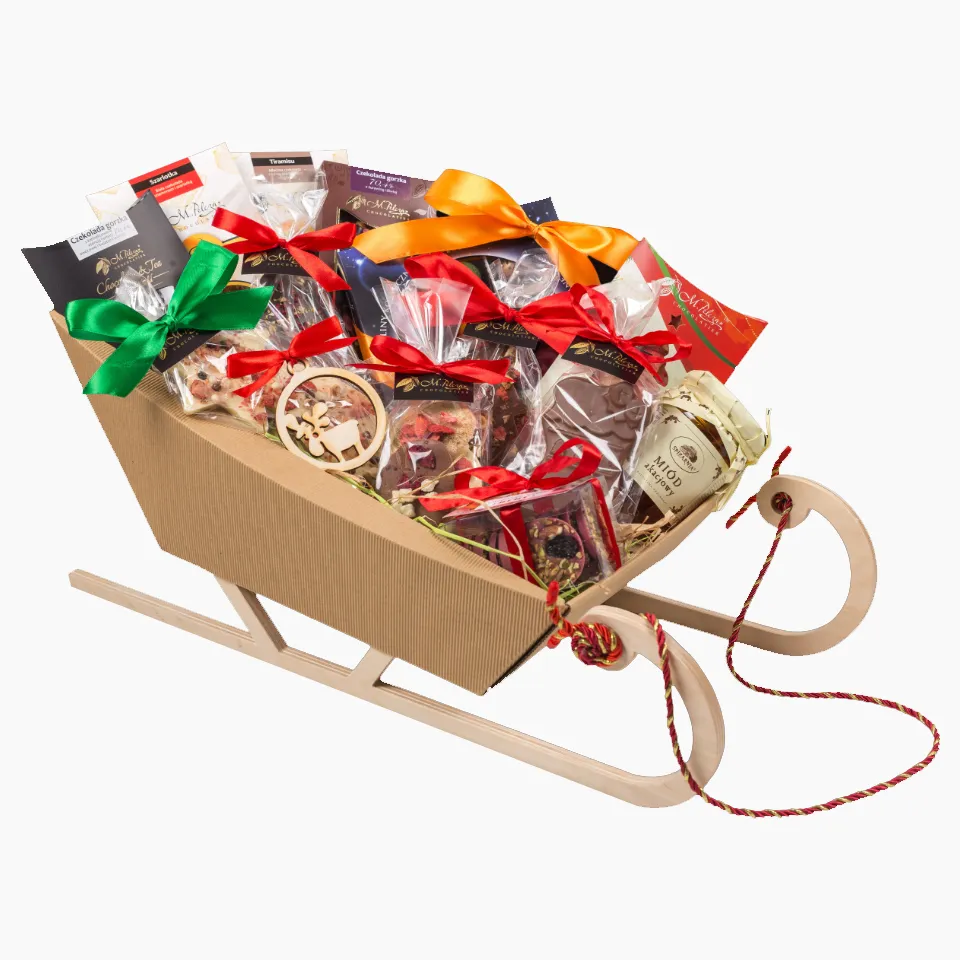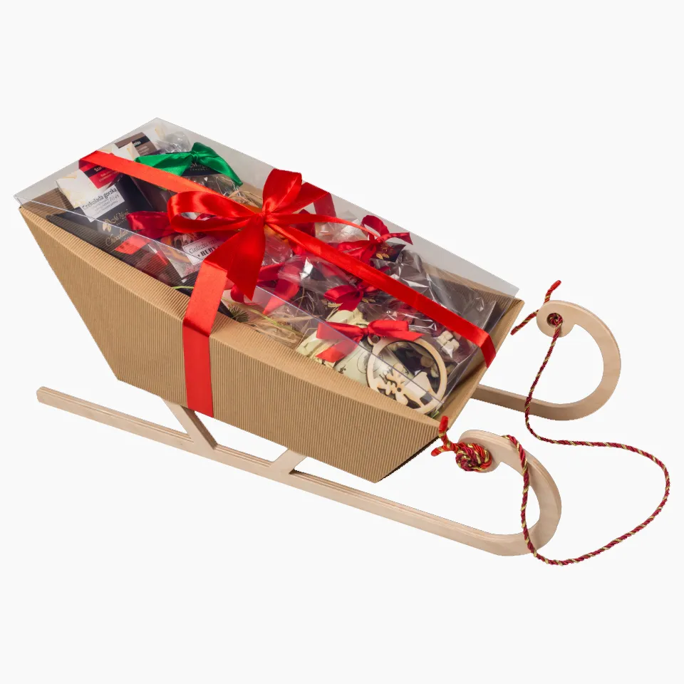 Zestaw zapakowany w tekturowe sanie z drewnianymi płozami, na wierzchu przezroczysta osłona, zestaw przewiązany wstążką