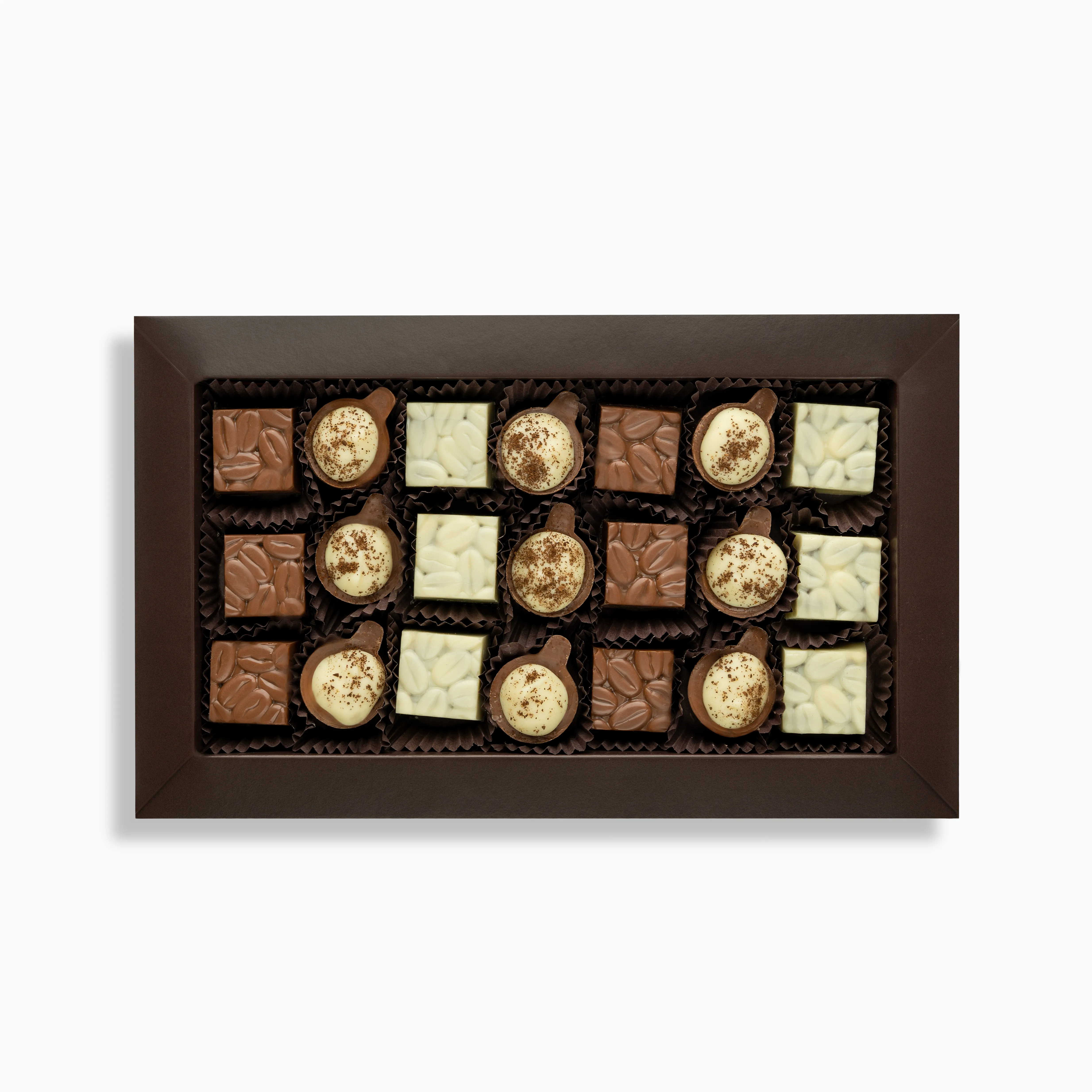 Orzech irish coffee: Smak świeżo mielonej kawy, w towarzystwie prawdziwej szkockiej whisky, zamknięte w mlecznej i białej czekoladzie.
