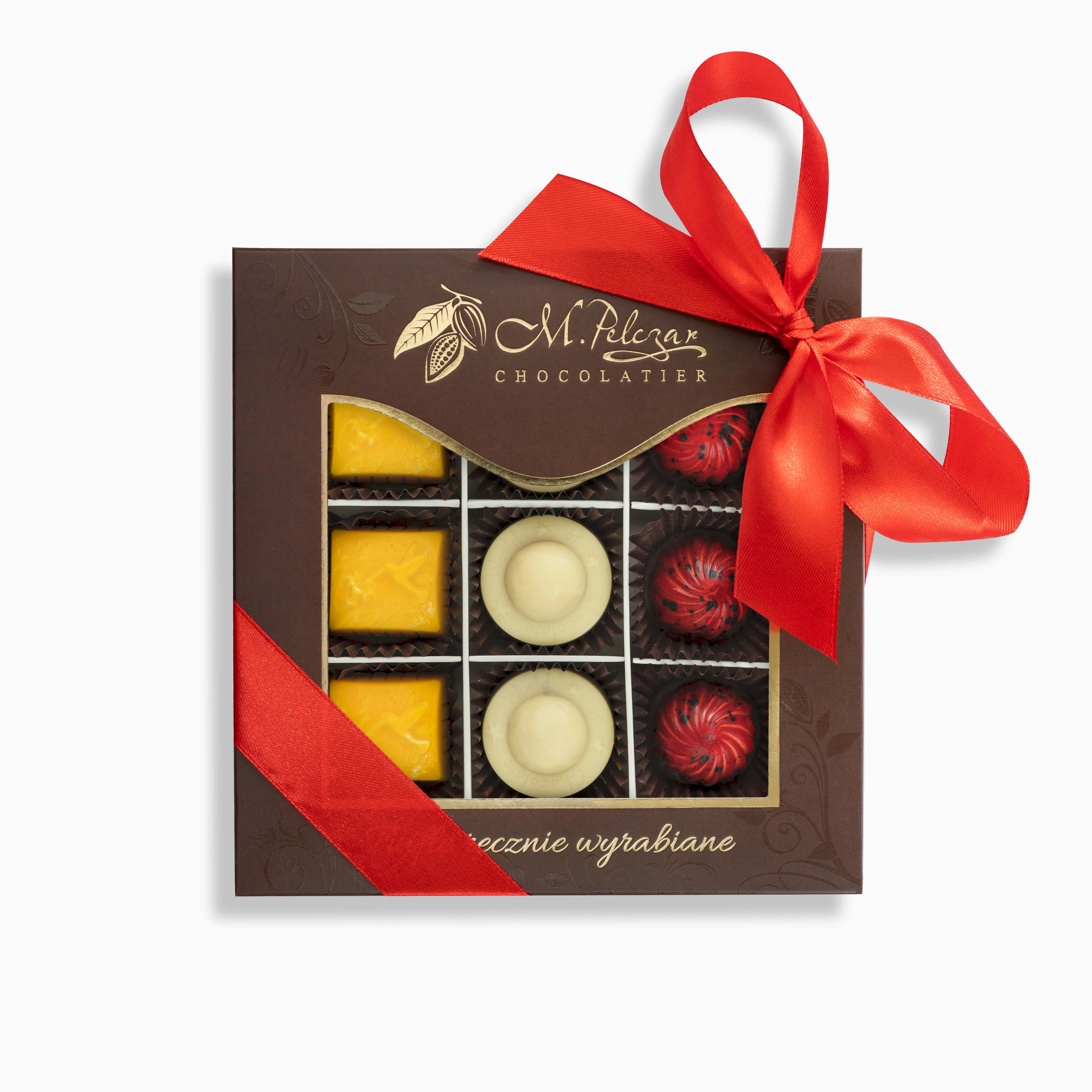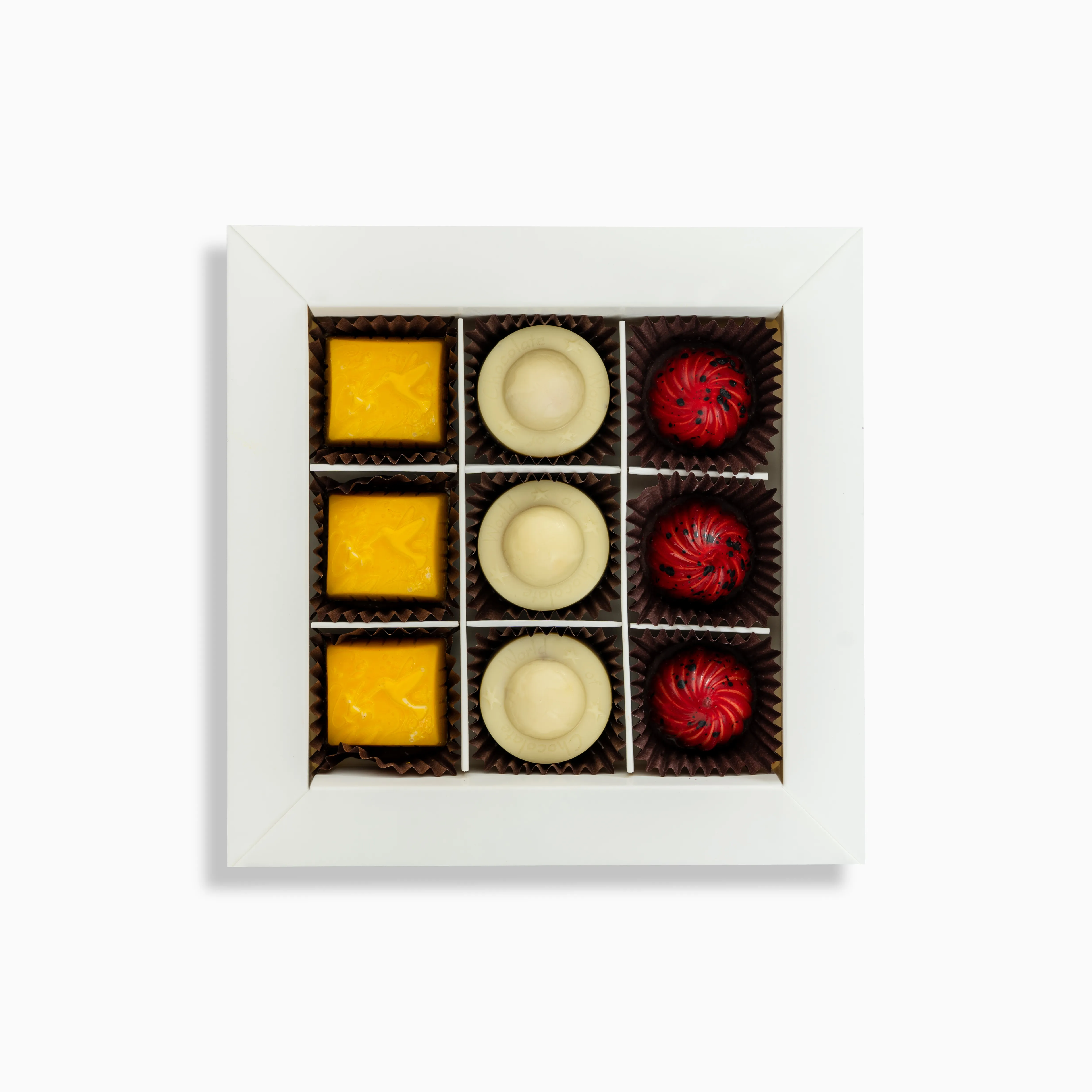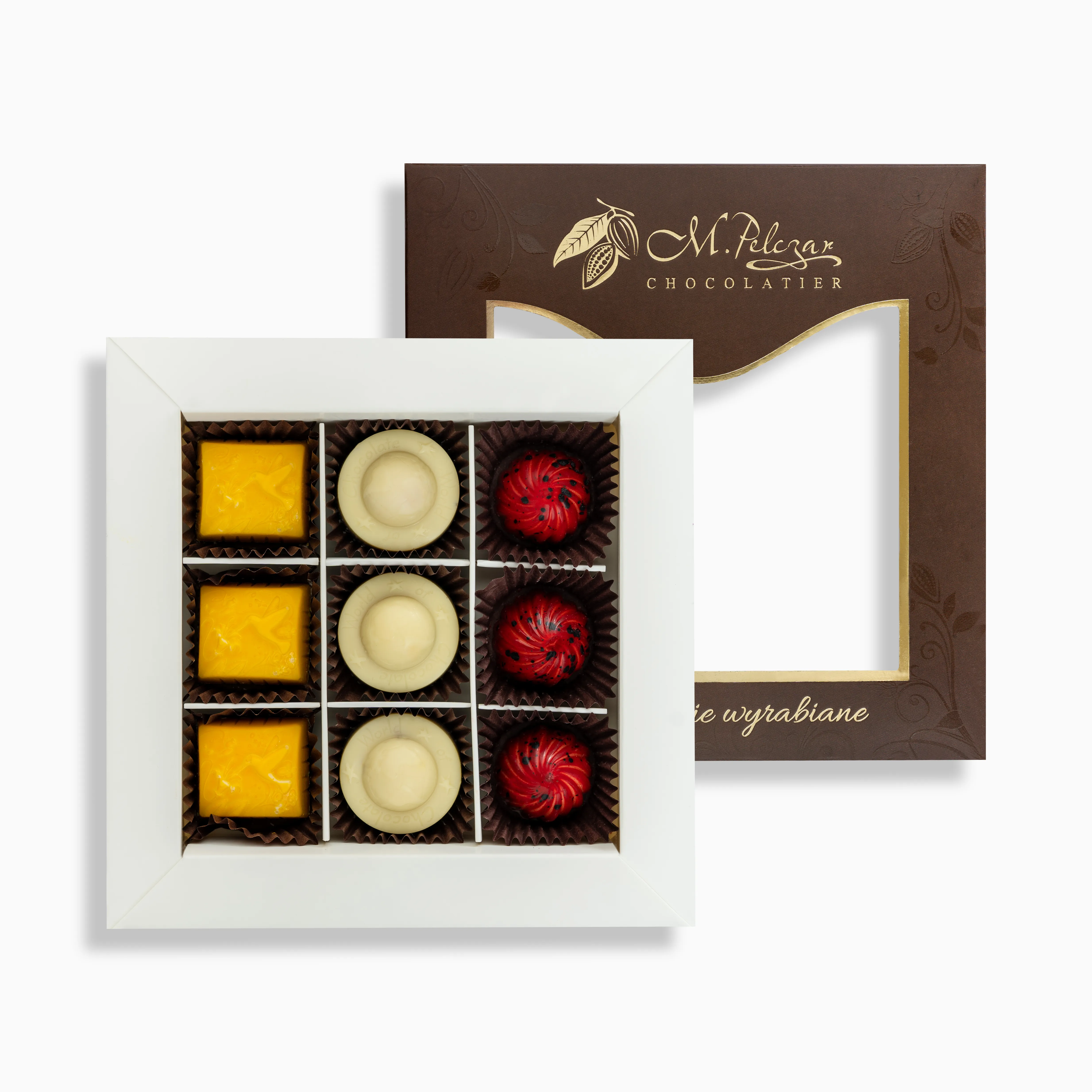Praliny marakuja: Delikatne białe nadzienie o smaku marakuja, zamknięte w białej czekoladzie, dekorowane barwnikiem spożywczym.