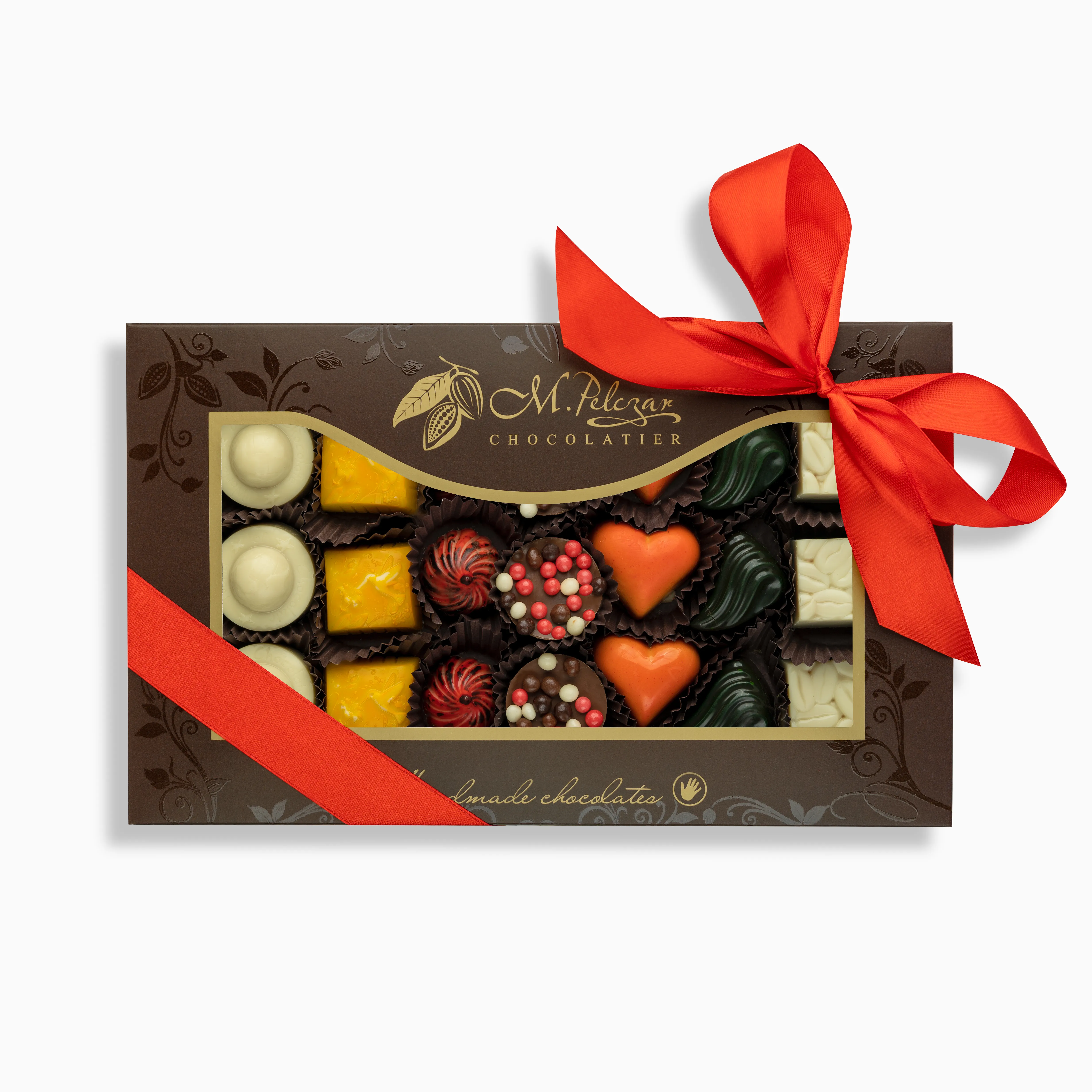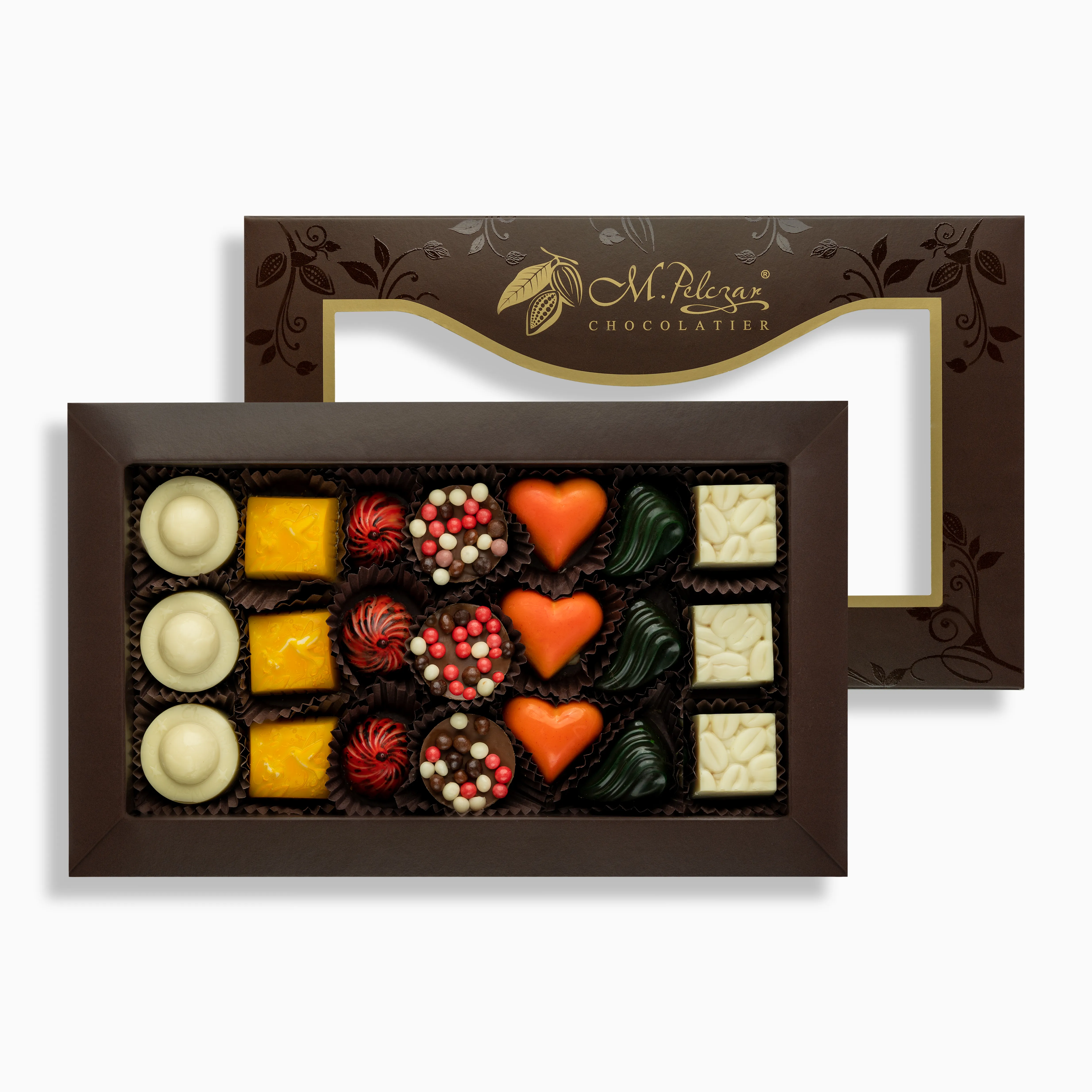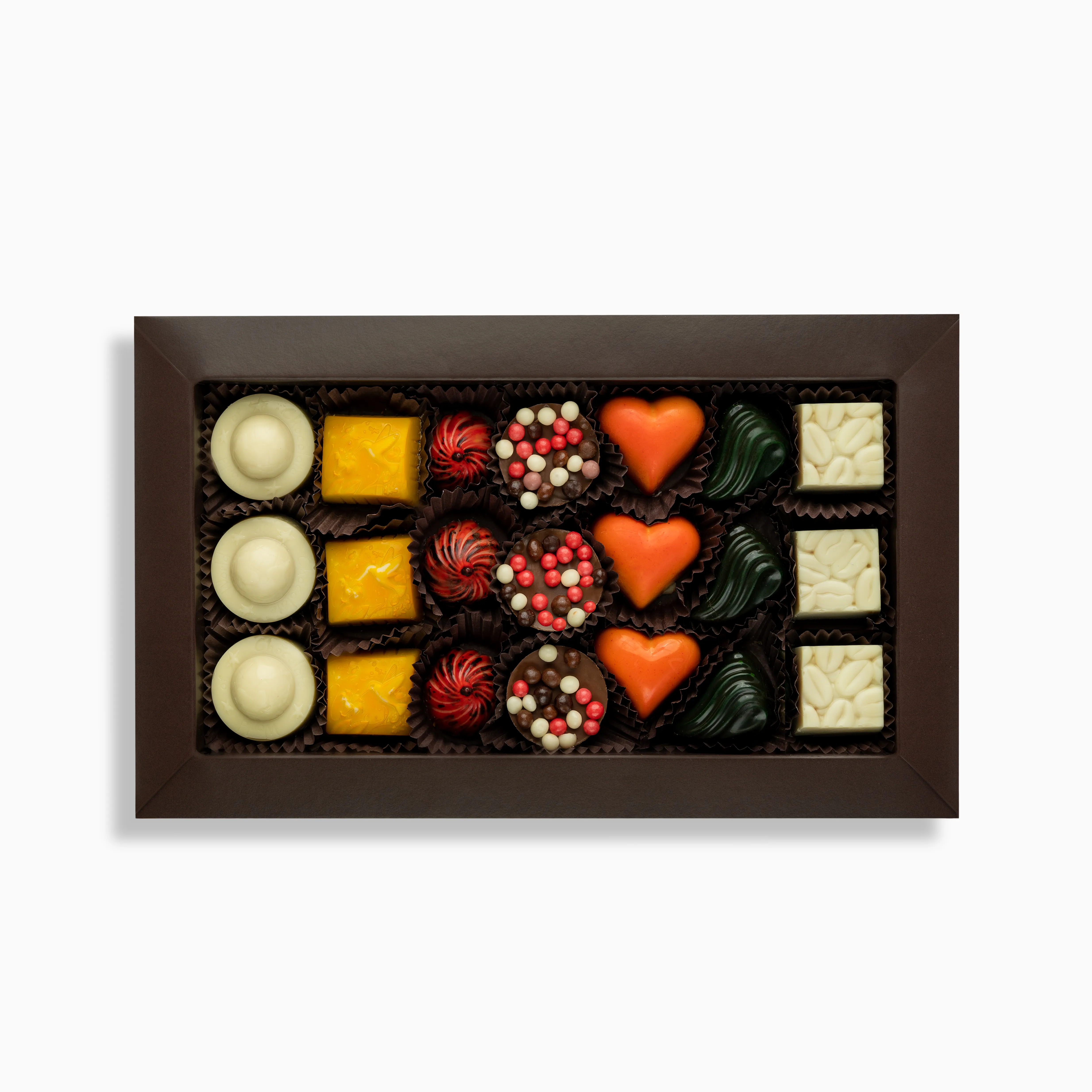 Praliny słony karmel i orzech laskowy: Aksamitne białe nadzienie ze słonym karmelem i orzechem laskowym, zamknięte w białej czekoladzie.